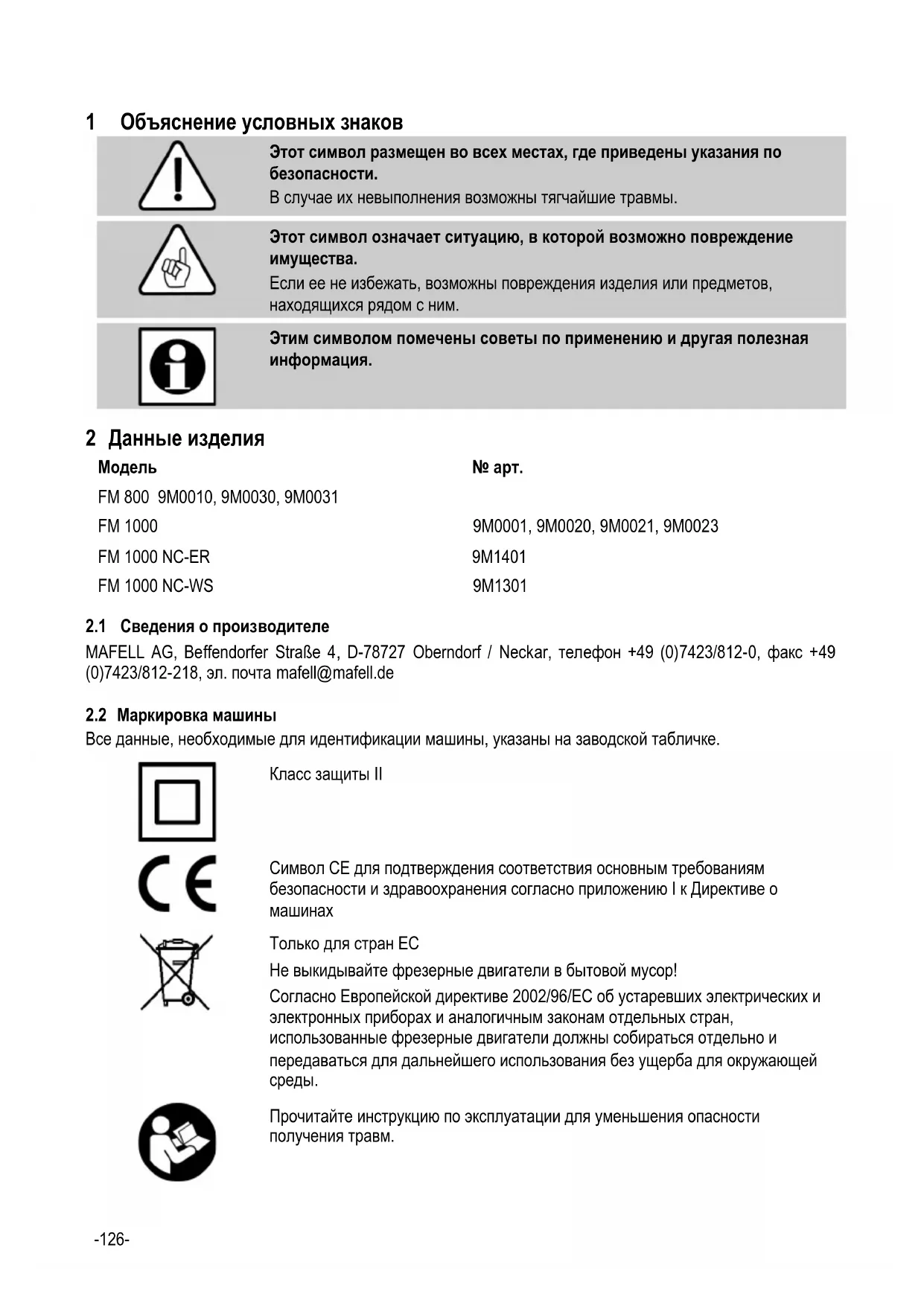 Всегда соблюдайте приведенные далее указания по безопасности и правила техники безопасности, действующие в стране, где применяется пила! Общие указания: - Запрещается обращаться с этой машиной детям и подросткам. Исключение составляют подростки, работающие под наблюдением специалиста с целью обучения. - Никогда не работайте без предписанных для соответствующей операции защитных устройств системы портала, в которой используется фрезерный двигатель. Не меняйте в системе портала и фрезерном двигателе ничего, что связано с техникой безопасности. - Поврежденные кабели или вилки следует немедленно заменить. Замена должна производиться только специалистами MAFELL или авторизованным сервисным центром MAFELL во избежание рисков угрозы для безопасности. - Избегайте резких перегибов кабеля. Особенно при транспортировке и хранении фрезерного двигателя не наматывайте кабель вокруг фрезерного двигателя. - Использование с водой или токопроводящими жидкостями запрещено. - Фрезерный двигатель не должен использоваться с ручным управлением. - Не подвергайте фрезерный двигатель воздействию дождя или влаги. Попадание воды во фрезерный двигатель повышает опасность поражения электрическим током. Не разрешается использовать: - Поврежденные и деформированные инструменты. - Тупые инструменты из-за слишком большой нагрузки двигателя. - Инструменты, которые не подходят для частоты вращения фрезерного двигателя на холостом ходу. Указания по применению средств личной защиты: - Во время работы всегда использовать защиту органов слуха. - Во время работы всегда использовать противопылевой респиратор. - При работе носите защитные очки.-130- Указания по эксплуатации: - Не прикасайтесь руками к опасному участку инструмента. - Проверяйте заготовку на наличие инородных тел. - Контролируйте частоту вращения. При возникновении неконтролируемого увеличения частоты вращения, скачка частоты вращения, необходимо немедленно отключить электроинструмент от источника питания. Указания по техническому обслуживанию и текущему ремонту: - Регулярная чистка фрезерного двигателя является важным фактором надежности - Разрешается использование только оригинальных запасных частей и принадлежностей фирмы MAFELL. В противном случае претензии, относящиеся к гарантии и ответственности изготовителя, не принимаются. 4 Оснащение / настройка