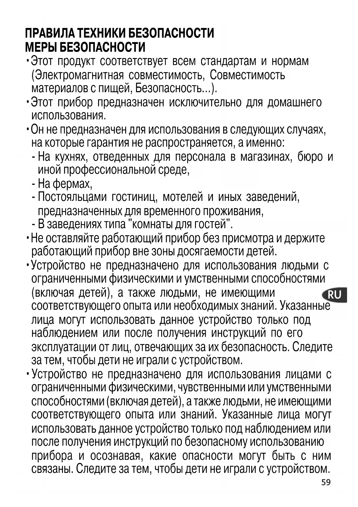 CREPARTY-new-2100078095 08/04/13 13:59 Page59Чистка или обслуживание устройства не должны производиться детьми, не достигшими восьмилетнего возраста, а также без контроля взрослых. Устройство и шнур питания следует хранить в месте, недоступном для детей, не достигших восьмилетнего