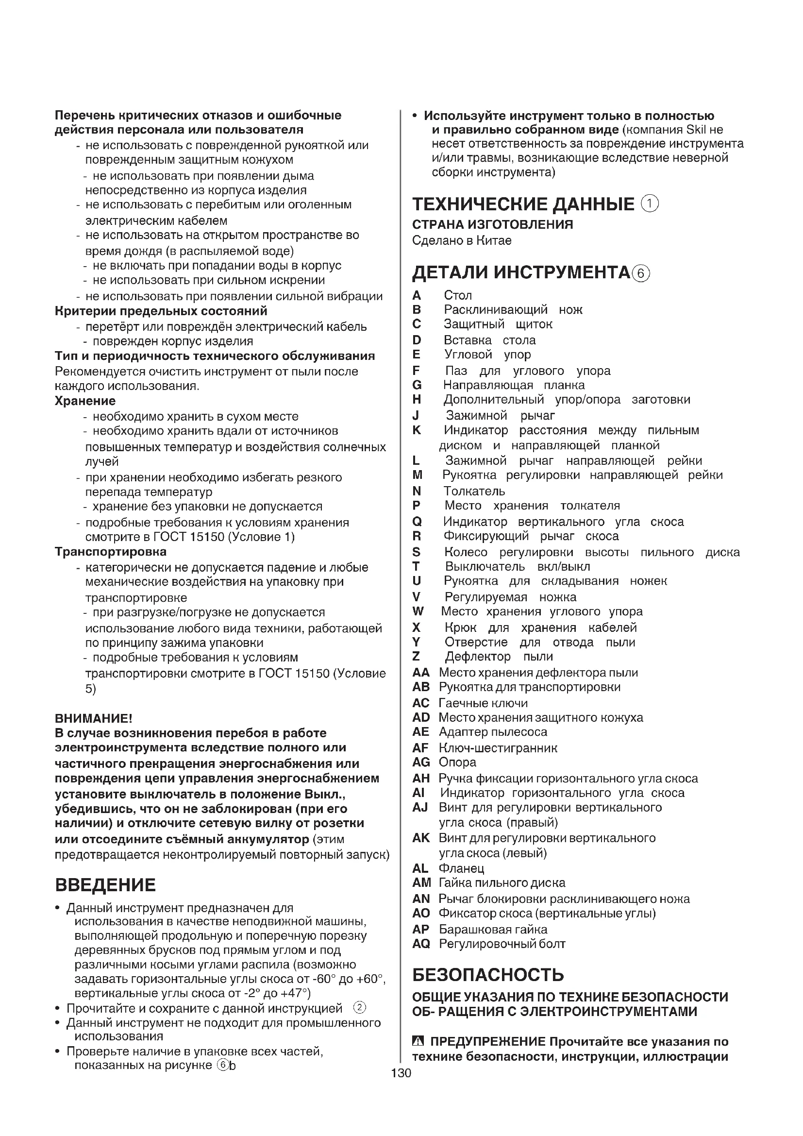 A Стол B Расклинивающий нож C Защитный щиток D Вставка стола E Угловой упор F Паз для углового упора G Направляющая планка H Дополнительный упор/опора заготовки J Зажимной рычаг K Индикатор расстояния между пильным диском и направляющей планкой L Зажимной рычаг направляющей рейки M Рукоятка регулировки направляющей рейки N Толкатель P Место хранения толкателя Q Индикатор вертикального угла скоса R Фиксирующий рычаг скоса S Колесо регулировки высоты пильного диска T Выключатель вкл/выкл U Рукоятка для складывания ножек V Регулируемая ножка W Место хранения углового упора X Крюк для хранения кабелей Y Отверстие для отвода пыли Z Дефлектор пыли AA Место хранения дефлектора пыли AB Рукоятка для транспортировки AC Гаечные ключи AD Место хранения защитного кожуха AE Адаптеp пылесоса AF Ключ-шестигранник AG Опора AH Ручка фиксации горизонтального угла скоса AI Индикатор горизонтального угла скоса AJ Винт для регулировки вертикального угла скоса (правый) AK Винт для регулировки вертикального угла скоса (левый) AL Фланец AM Гайка пильного дис ка AN Рычаг блокировки расклинивающего ножа AO Фиксатор скоса (вертикальные углы) AP Барашковая гайка AQ Регулировочный болт БЕЗОПАСНОСТЬ ОБЩИЕ УКАЗАНИЯ ПО ТЕХНИКЕ БЕЗОПАСНОСТИ ОБ- РАЩЕНИЯ С ЭЛЕКТРОИНСТРУМЕНТАМИ - ПРЕДУПРЕЖЕНИЕ Прочитайте все указания по технике безопасности, инструкции, иллюстрации Перечень критических отказов и ошибочные действия персонала или пользователя - не использовать с поврежденной рукояткой или поврежденным защитным кожухом - не использовать при появлении дыма непосредственно из корпуса изделия - не использовать с перебитым или оголенным электрическим кабелем - не использовать на открытом пространстве во время дождя (в распыляемой воде) - не включать при попадании воды в корпус - не использовать при сильном искрении - не использовать при появлении сильной вибрации Критерии предельных состояний - перетёрт или повреждён электрический кабель - поврежден корпус изделия Тип и периодичность технического обслуживания Рекомендуется очистить инструмент от пыли после каждого использования.