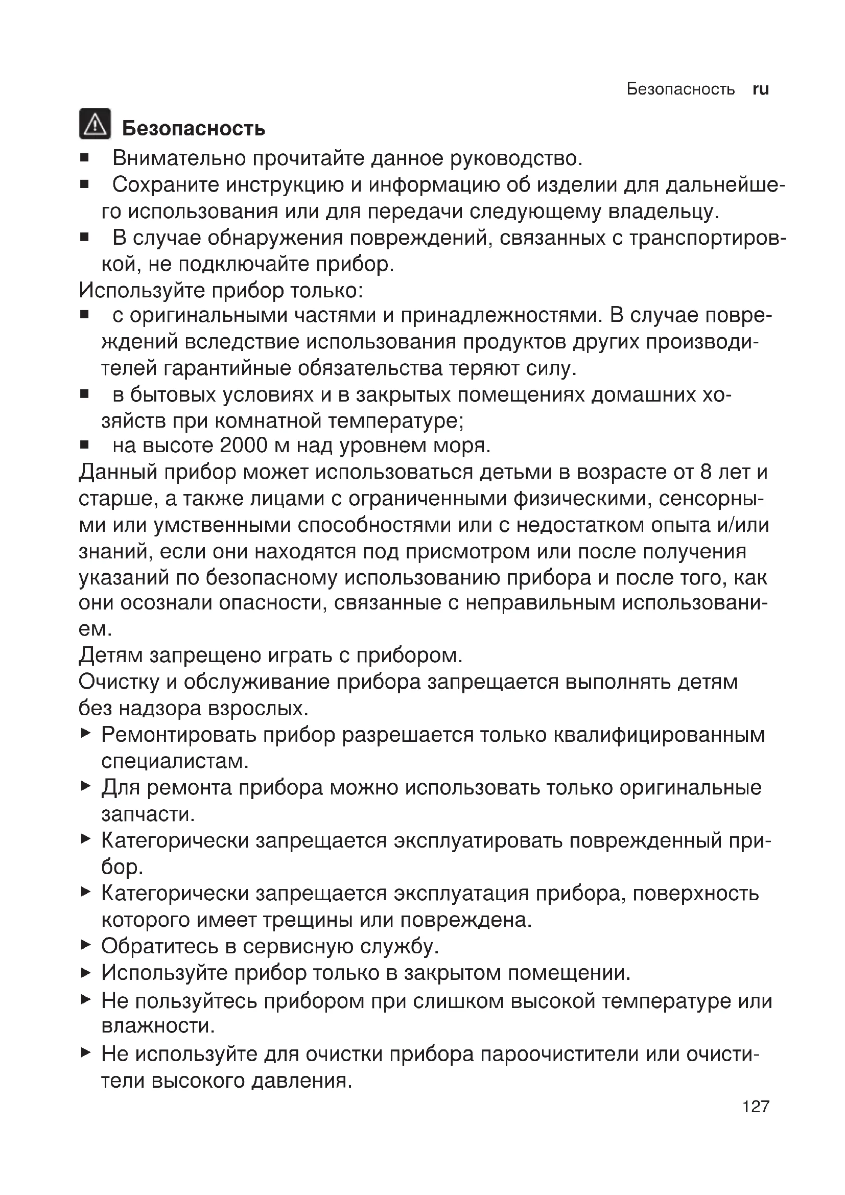 Безопасность ¡ Внимательно прочитайте данное руководство. ¡ Сохраните инструкцию и информацию об изделии для дальнейше- го использования или для передачи следующему владельцу. ¡ В случае обнаружения повреждений, связанных с транспортиров- кой, не подключайте прибор. Используйте прибор только: ¡ с оригинальными частями и принадлежностями. В случае повре- ждений вследствие использования продуктов других производи- телей гарантийные обязательства теряют силу. ¡ в бытовых условиях и в закрытых помещениях домашних хо- зяйств при комнатной температуре; ¡ на высоте 2000м над уровнем моря. Данный прибор может использоваться детьми в возрасте от 8 лет и старше, а также лицами с ограниченными физическими, сенсорны- ми или умственными способностями или с недостатком опыта и/или знаний, если они находятся под присмотром или после получения указаний по безопасному использованию прибора и после того, как они осознали опасности, связанные с неправильным использовани-