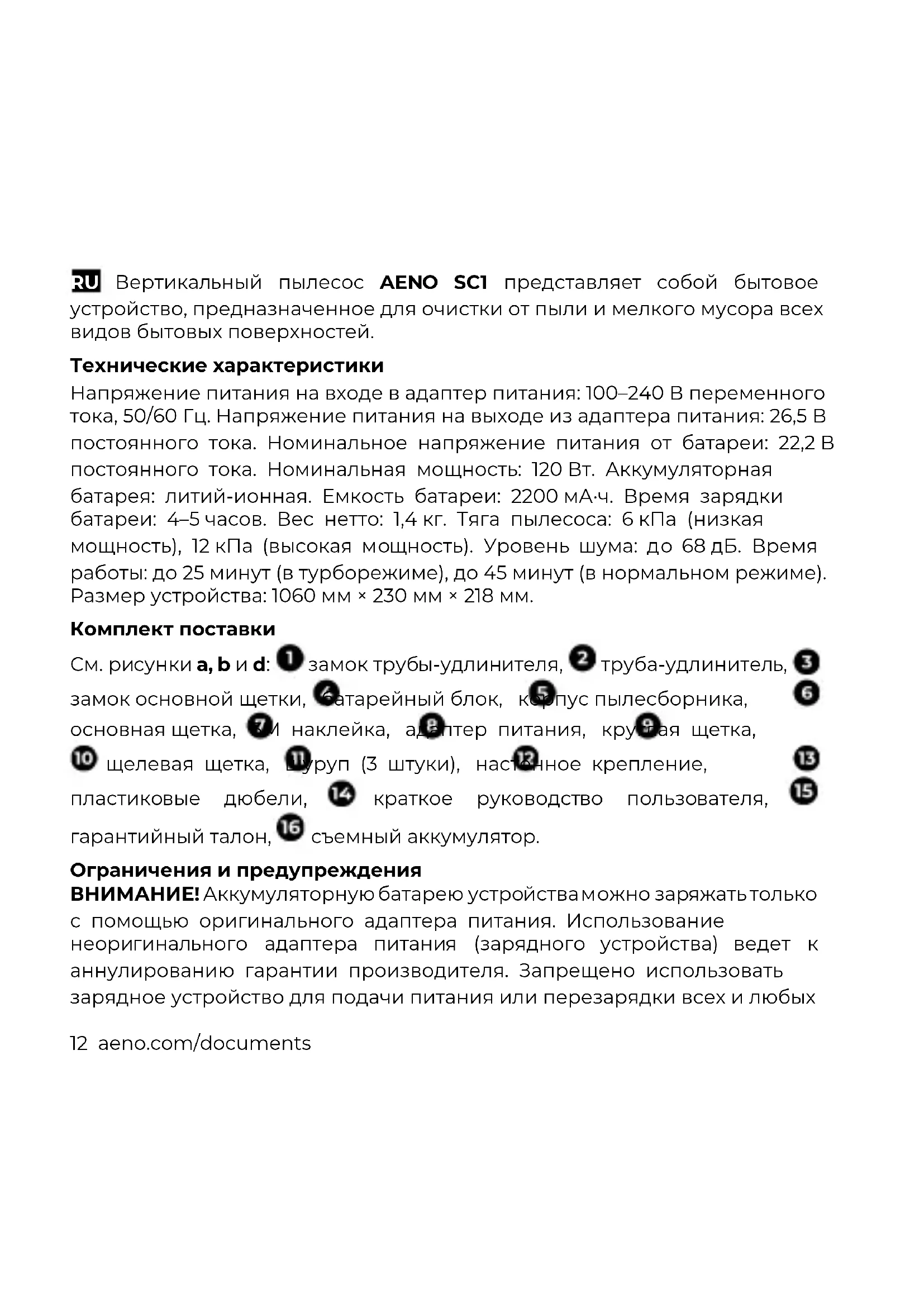 The warranty period and service life shall be 2 years as from the date of purchase of the device. Manufacturer: ASBISc Enterprises PLC, 43 Kolonakiou Street, Diamond Court, Ayios Athanasios, 4103 Limassol, Cyprus. Made in China. For current information and details on the device description and specification, as well as connection process, certificates, warranty and quality issues, see relevant Installation and Operation Manuals available for downloading at aeno.com/documents. All trademarks and names herein are the property of their respective owners.12 aeno.com/documents RU Вертикальный пылесос AENO SC1 представляет собой бытовое устройство, предназначенное для очистки от пыли и мелкого мусора всех видов бытовых поверхностей. Технические характеристики Напряжение питания на входе в адаптер питания: 100–240 В переменного тока, 50/60 Гц. Напряжение питания на выходе из адаптера питания: 26,5 В постоянного тока. Номинальное напряжение питания от батареи: 22,2 В постоянного тока. Номинальная мощность: 120 Вт. Аккумуляторная батарея: литий-ионная. Емкость батареи: 2200 мА·ч. Время зарядки батареи: 4–5 часов. Вес нетто: 1,4 кг. Тяга пылесоса: 6 кПа (низкая мощность), 12 кПа (высокая мощность). Уровень шума: до 68 дБ. Время работы: до 25 минут (в турборежиме), до 45 минут (в нормальном режиме). Размер устройства: 1060 мм × 230 мм × 218 мм. Комплект поставки См. рисунки а, b и d: замок трубы-удлинителя, труба-удлинитель, замок основной щетки, батарейный блок, корпус пылесборника, основная щетка, 3М наклейка, адаптер питания, круглая щетка, щелевая щетка, шуруп (3 штуки), настенное крепление, пластиковые дюбели, краткое руководство пользователя, гарантийный талон, съемный аккумулятор. Ограничения и предупреждения ВНИМАНИЕ! Аккумуляторную батарею устройства можно заряжать только с помощью оригинального адаптера питания. Использование неоригинального адаптера питания (зарядного устройства) ведет к аннулированию гарантии производителя. Запрещено использовать зарядное устройство для подачи питания или перезарядки всех и любыхaeno.com/documents 13 несовместимых устройств. Производитель не несет ответственности за любые последствия, будь то прямые либо косвенные, возникающие вследствие использования адаптера питания не по назначению либо для подачи питания или перезарядки устройства, не входящего в настоящий комплект поставки. Перед началом технического обслуживания убедитесь, что пылесос отключен от адаптера питания. Не погружайте пылесос и любые его части в воду или любую другую жидкость. Не используйте для ухода за пылесосом агрессивные и легковоспламеняющиеся средства. Регулярно прочищайте фильтр пылесоса. Отсоедините адаптер питания после полной зарядки. Не устанавливайте настенный кронштейн в местах, подверженных воздействию прямых солнечных лучей или чрезмерно высокой температуры. Не используйте адаптер питания, если на его вилке или шнуре имеются повреждения. Не пытайтесь засосать в пылесос горящие объекты (окурки, спички, пепел) и чрезмерно измельченный строительный мусор (например, известь, цемент, гипсовый порошок и так далее), крупные острые предметы и осколки (например, стекло, гвозди, иглы), агрессивные жидкости (растворитель, очиститель, кислоты и так далее), легковоспламеняющиеся и взрывоопасные жидкости (например, бензин, спиртосодержащие продукты). Избегайте попадания волос, незакрепленных элементов одежды, пальцев и других частей тела в воздуховод и движущиеся детали пылесоса. Не направляйте воздуховодную трубку пылесоса, ручку или иные инструменты в глаза, уши и другие уязвимые места тела. Внимательно изучи