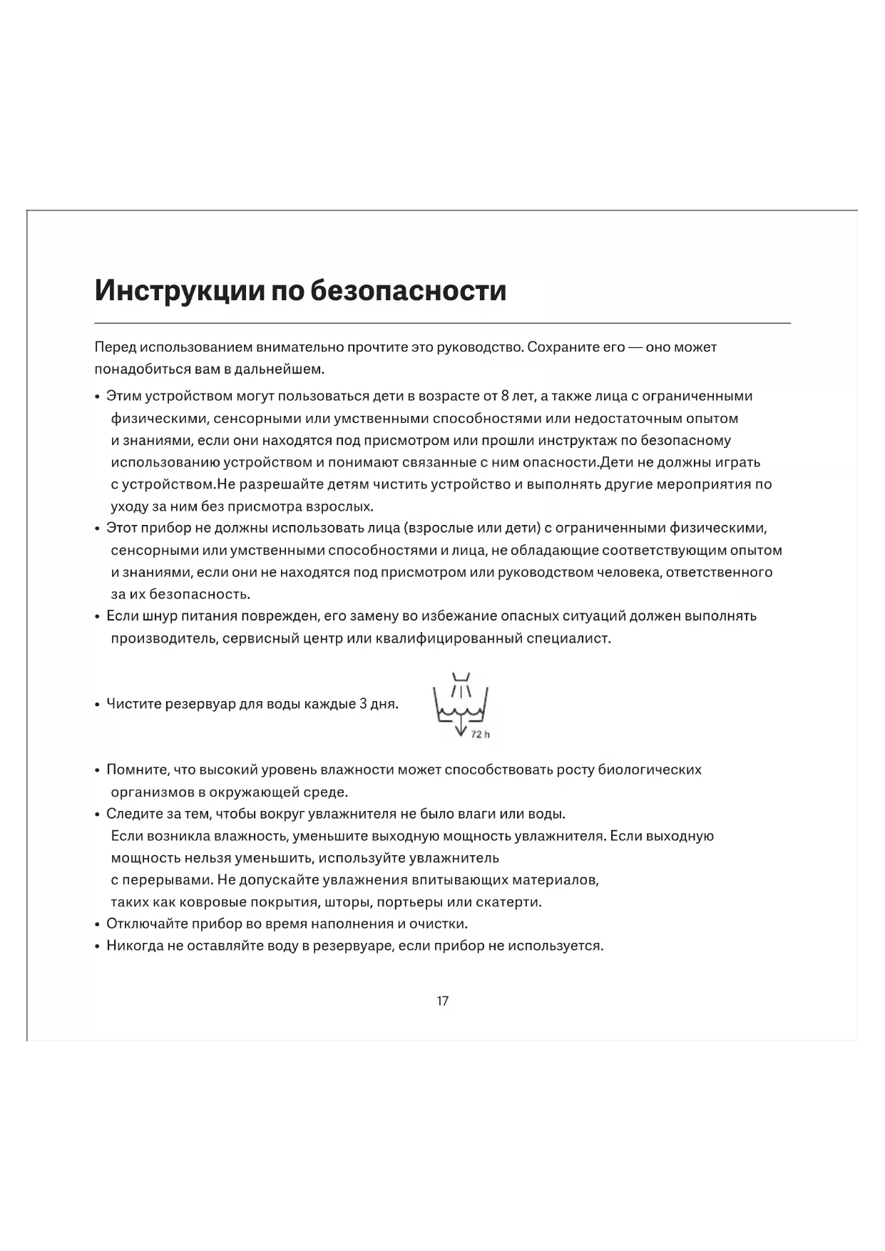 Инструкции по безопасности• Опорожните и очистите увлажнитель перед хранением. Очистите увлажнитель перед следующим использованием.