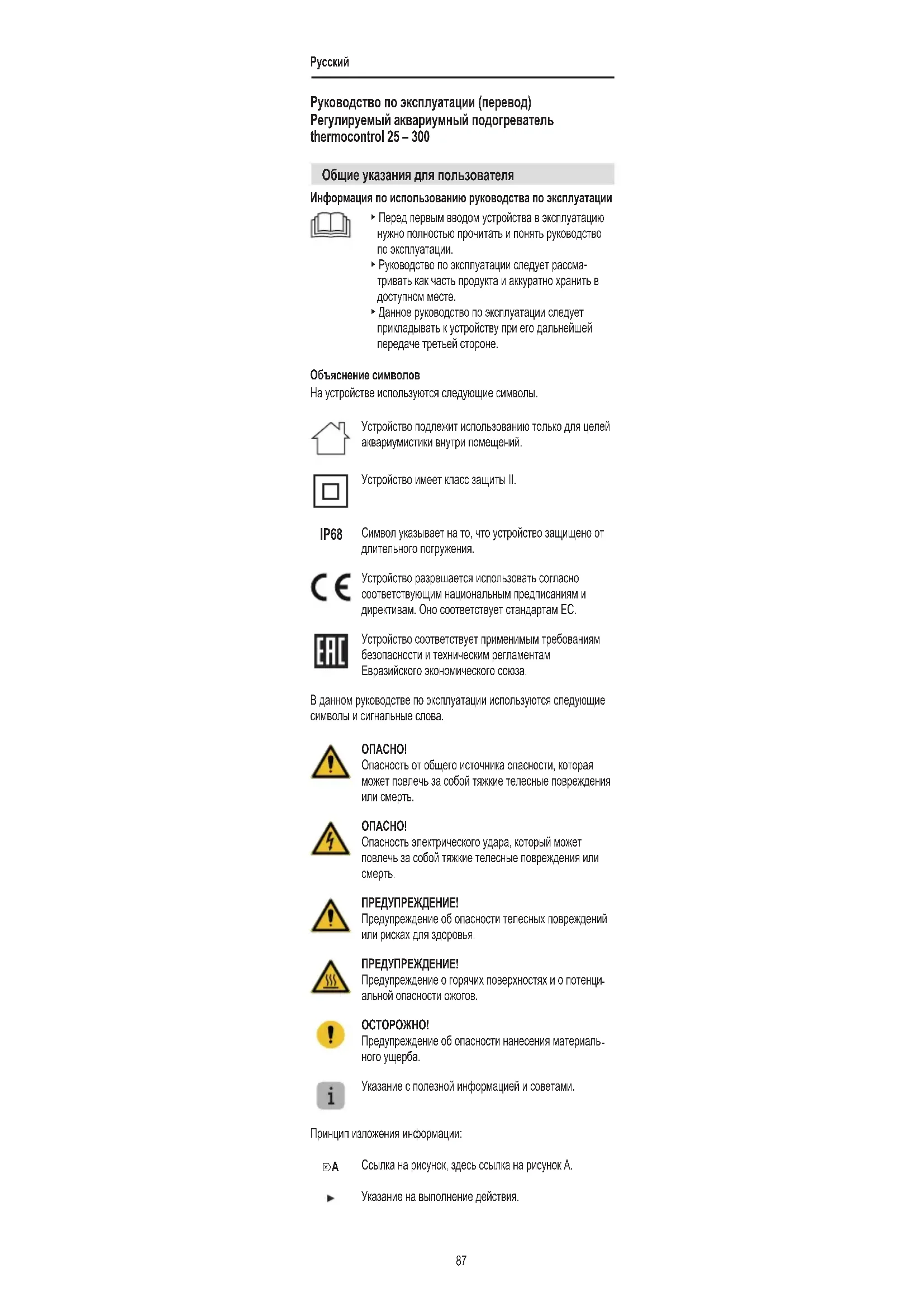 тривать как часть продукта и аккуратно хранить в доступном месте. ▶ Данное руководство по эксплуатации следует прикладывать к устройству при его дальнейшей передаче третьей стороне. Объяснение символов На устройстве используются следующие символы. Устройство подлежит использованию только для целей аквариумистики внутри помещений. Устройство имеет класс защиты II. IP68 Символ указывает на то, что устройство защищено от длительного погружения. Устройство разрешается использовать согласно соответствующим национальным предписаниям и директивам. Оно соответствует стандартам ЕС. Устройство соответствует применимым требованиям безопасности и техническим регламентам Евразийского экономического союза. В данном руководстве по эксплуатации используются следующие символы и сигнальные слова.