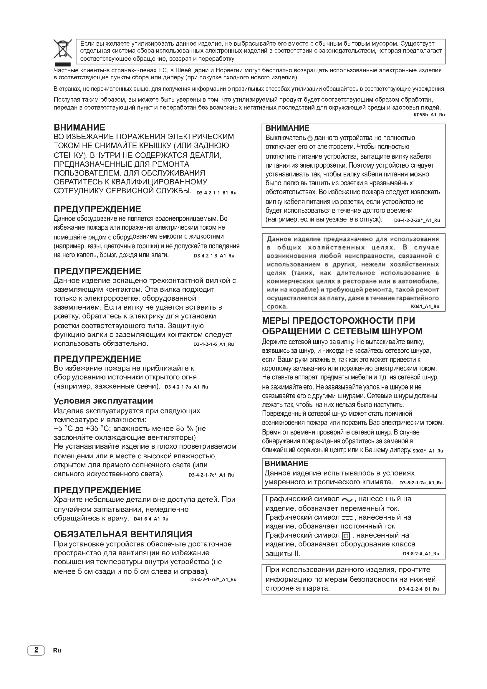 дан в соответствующий пункт и переработан без возможных негативных последствий для окружающей среды и здоровья людей. K058b_A1_Ru МЕРЫ ПРЕДОСТОРОЖНОСТИ ПРИ ОБРАЩЕНИИ С СЕТЕВЫМ ШНУРОМ Держите сетевой шнур за вилку. Не вытаскивайте вилку, взявшись за шнур, и никогда не касайтесь сетевого шнура, если Ваши руки влажные, так как это может привести к короткому замыканию или поражению электрическим током. Не ставьте аппарат, предметы мебели и т.д. на сетевой шнур, не зажимайте его. Не завязывайте узлов на шнуре и не связывайте его с другими шнурами. Сетевые шнуры должны лежать так, чтобы на них нельзя было наступить. Поврежденный сетевой шнур может стать причиной возникновения пожара или поразить Вас электрическим током. Время от времени проверяйте сетевой шнур. В случае обнаружения повреждения обратитесь за заменой в ближайший сервисный центр или к Вашему дилеру. S002*_A1_Ru K041_A1_Ru При использовании данного изделия, прочтите информацию по мерам безопасности на нижней стороне аппарата. D3-4-2-2-4_B1_Ru