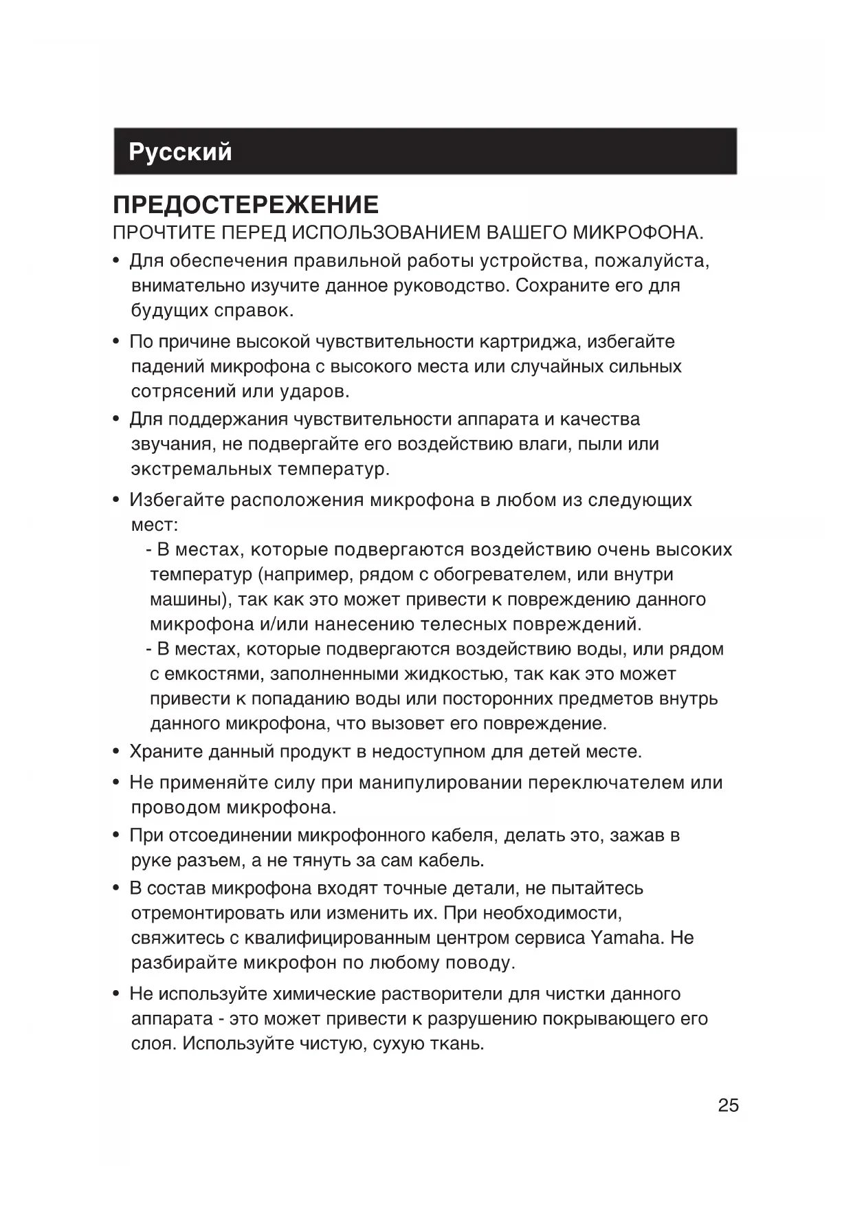 - В состав микрофона входят точные детали, не пытайтесь отремонтировать или изменить их. При необходимости, свяжитесь с квалифицированным центром сервиса Yamaha. Не разбирайте микрофон по любому поводу.