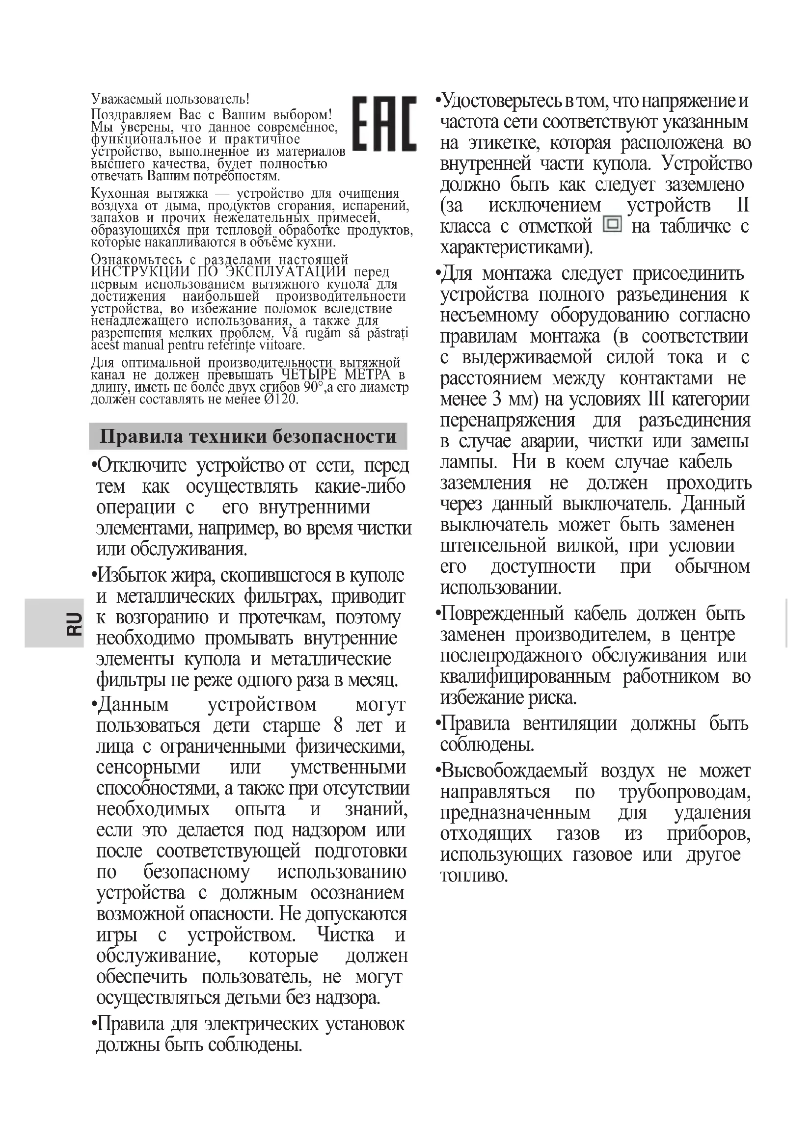 HURU Уважаемый пользователь! Поздравляем Вас с Вашим выбором! Мы уверены, что данное современное, функциональное и практичное устройство, выполненное из материалов высшего качества, будет полностью отвечать Вашим потребностям. Кухонная вытяжка — устройство для очищения воздуха от дыма, продуктов сгорания, испарений, запахов и прочих нежелательных примесей, образующихся при тепловой обработке продуктов, которые накапливаются в объёме кухни. Ознакомьтесь с разделами настоящей ИНСТРУКЦИИ ПО ЭКСПЛУАТАЦИИ перед первым использованием вытяжного купола для достижения наибольшей производительности устройства, во избежание поломок вследствие ненадлежащего использования, а также для разрешения мелких проблем. Vă rugăm să păstrați acest manual pentru referințe viitoare. Для оптимальной производительности вытяжной канал не должен превышать ЧЕТЫРЕ МЕТРА в длину, иметь не более двух сгибов 90°,а его диаметр должен составлять не менее Ø120.