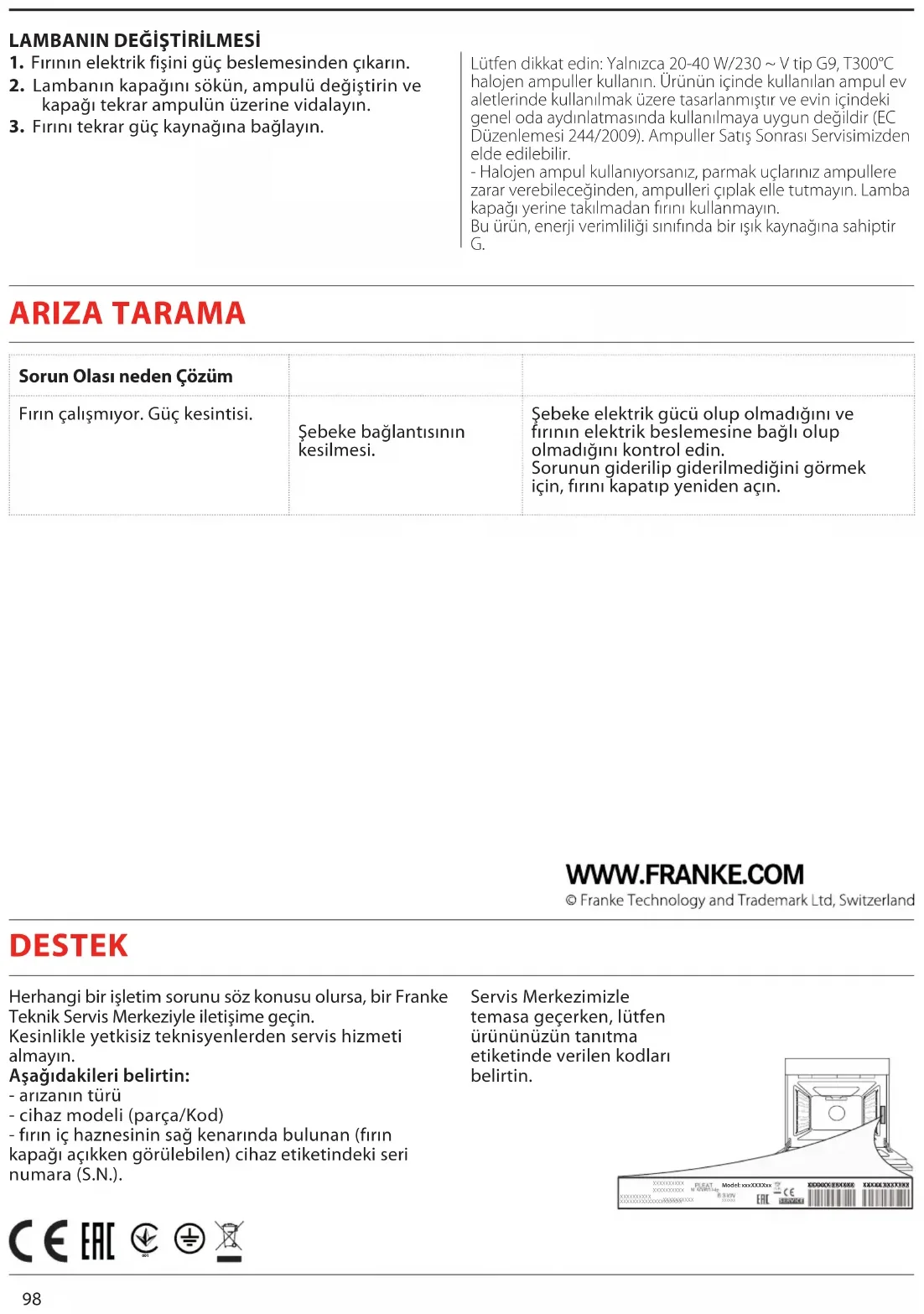 - При установке галогенных ламп не касайтесь их голыми руками, так как отпечатки пальцев могут привести к повреждению лампы. Не используйте духовой шкаф до установки плафона на место. Это изделие имеет источник света класса энергоэффективности G. Неисправность Возможная причина Способ устранения Печь не работает Отсутствует напряжение