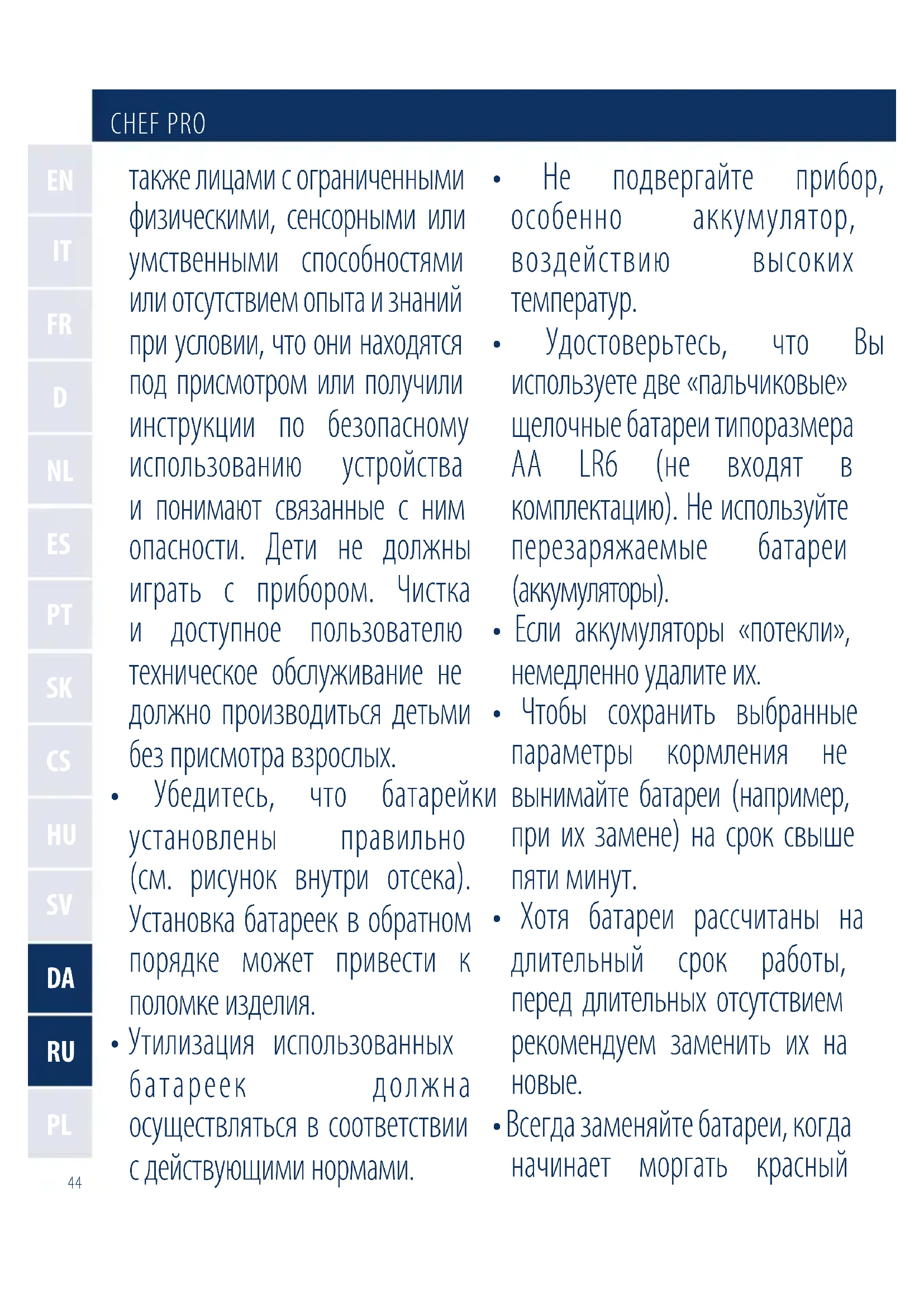 - Чтобы сохранить выбранные параметры кормления не вынимайте батареи (например, при их замене) на срок свыше пяти минут.