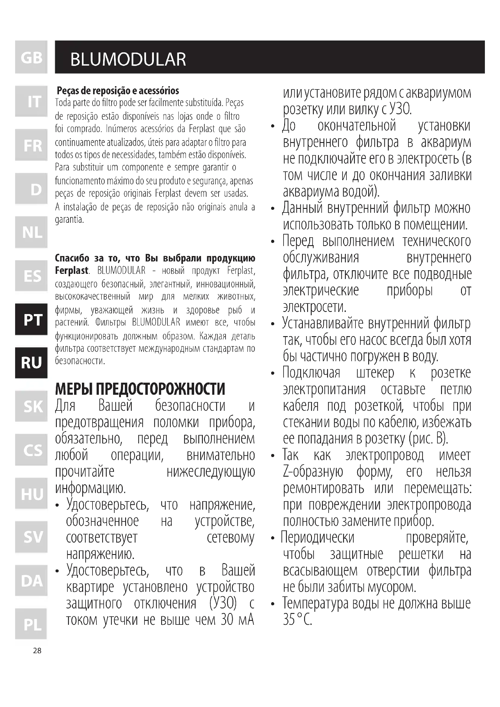 - При замене вышедших из строя дет алей используйте только оригинальные запасные части Ferplast. Применение неоригинальных запасных частей приводит к аннулиро ванию гарантийных обязательств. Запасные части и принадлежности Каждая часть фильтра может быть легко заменена. Запасные части можно прио б рести в специализированных зоомагазинах, где внутренний фильтр был куплен. Многочисленные принадлежности Ferplast, ассортимент которых непрерывно обновляется и расширяется, необходимы для того, чтобы расширить BLUMODULAR 360069-3_FI BLUMODULAR.indd 31 09/08/18 14:4332