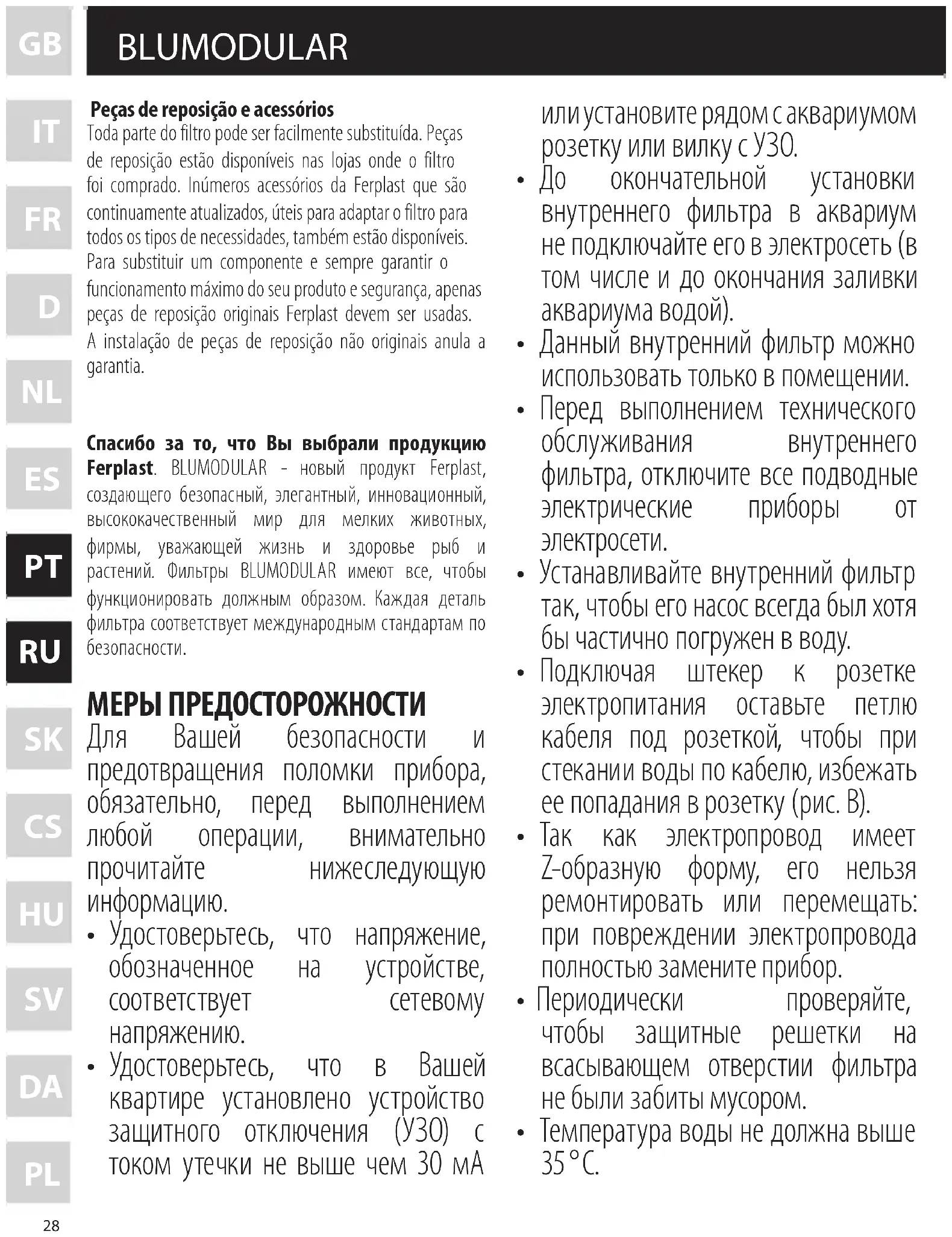 - флейта (трубка с отверсти ям и) с проб кой-заглушкой (рис. O). BLUMODULAR - универсальный внутренний фильтр, который может использов ат ь ся в различных целях в любом аквариуме. Он может применятьс я как основной фильтр для очис тки аквариума маленького или среднего размера, а также как дополнительный фильтр (лучше - совместно с биологическим фи льтром BLUWAVE со следующими наполнителями: активированным углем BLUCARBON, цеолитом BLUZEOLITE, синтетическим волокном BLUFIBRE, смолами и другие адсорбирующими или химическими материалами). Внутренний фильтр BLUMODULAR помогает поддерживать воду в чистоте даже в перенаселенных аквариум ах. Модули (котор ые могут быть соединены между собой и добавлены при желании) позволяют одн овр еменно исп ользов ат ь различные материалы, гарантируя высокую мощь и быстр о е течение. Указанные материалы могут бы т ь заменены по желанию. В любом случае, губка с крупными порами должна использоваться в первом модуле (внизу фильтра), чтобы собирать крупные частицы. Друг и е могут быть заполнены фильтрующими наполнителями по желанию. Будьте осторожны пр и использовании перлона с высокой плотностью: это может значительно сократить поток воды или фильтр будет быстро засорен. Такой фильтрующий материал до лжен быт ь помещен в самом верхнем модуле перед насосом. Техническое обсл ужива ни е внутреннего фильтра BLUMODULAR Ниже приведены рекомендации по периодическому обслуживанию вну треннего фильтра: 1 (рис. L) По крайней мере, каж дые две-три недели промывайте губки механической фильтрации 2 Не реже, чем раз в шес ть месяцев заменяйте губки механической фильтрации. Используй те только оригинальные запасные части Ferplast. 3 Адсорбирующая губка теряет свои свойства через две-три недели. Поэтому мы рекомендуем заменять ее при необходимости оригинальными запасными частями, продающимися в специализированных зоомагазинах, или оставлять старые губки для механической фильтрации, промыва я их раз в две-три недели. В любом случае губки необходимо заменять не реже, чем раз в полгода. 4 При лечении рыб в аквариуме адсорбирующую губку необходимо удалить из фильтр а (чтобы не снизить BLUMODULAR 360069-3_FI BLUMODULAR.indd 30 09/08/18 14:4331
