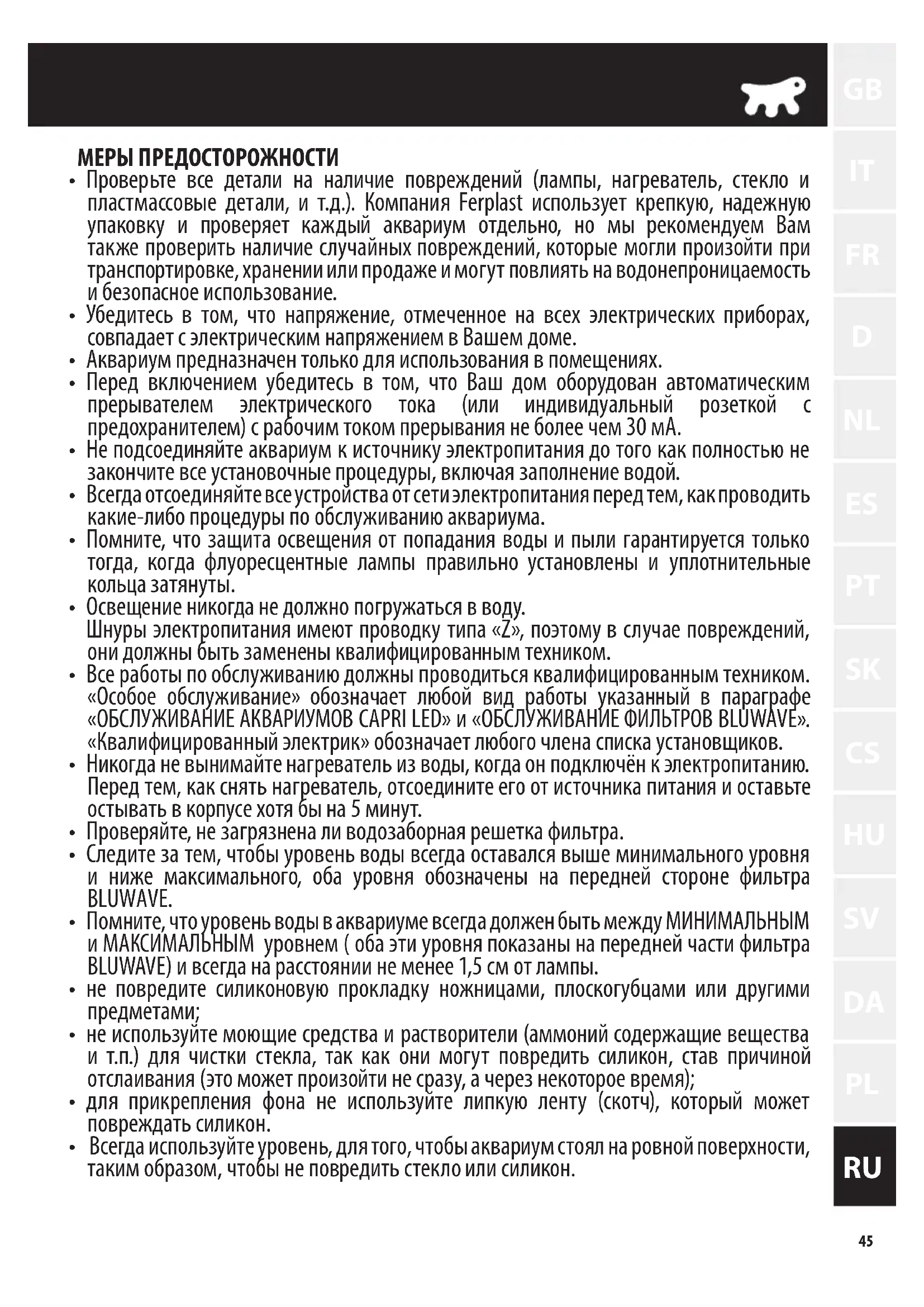 - Проверьте все детали на наличие повреждений (лампы, нагреватель, стекло и пластмассовые детали, и т.д.). Компания Ferplast использует крепкую, надежную упаковку и проверяет каждый аквариум отд ельно, но мы рекомендуем Вам также проверить наличие случайных повреждений, которые могли произойти при транспортировке, хранении или продаже и могут повлиять на водонепрони цаемость и безопасное использование.
