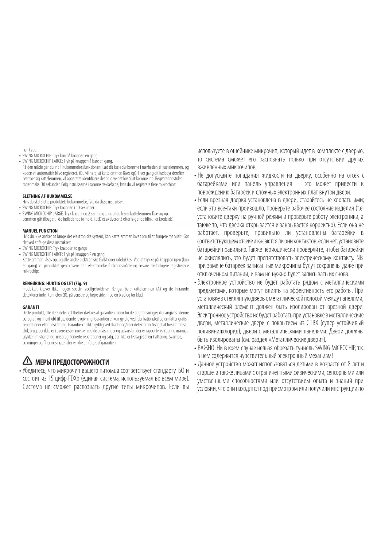 - Используйте только алкалиновые батарейки хорошего качества (1.5 V AA LR6 для дверки SWING MICROCHIP и 1.5 V С LR14 для SWING MICROCHIP LARGE), чтобы гарантировать хорошую работу устройства.