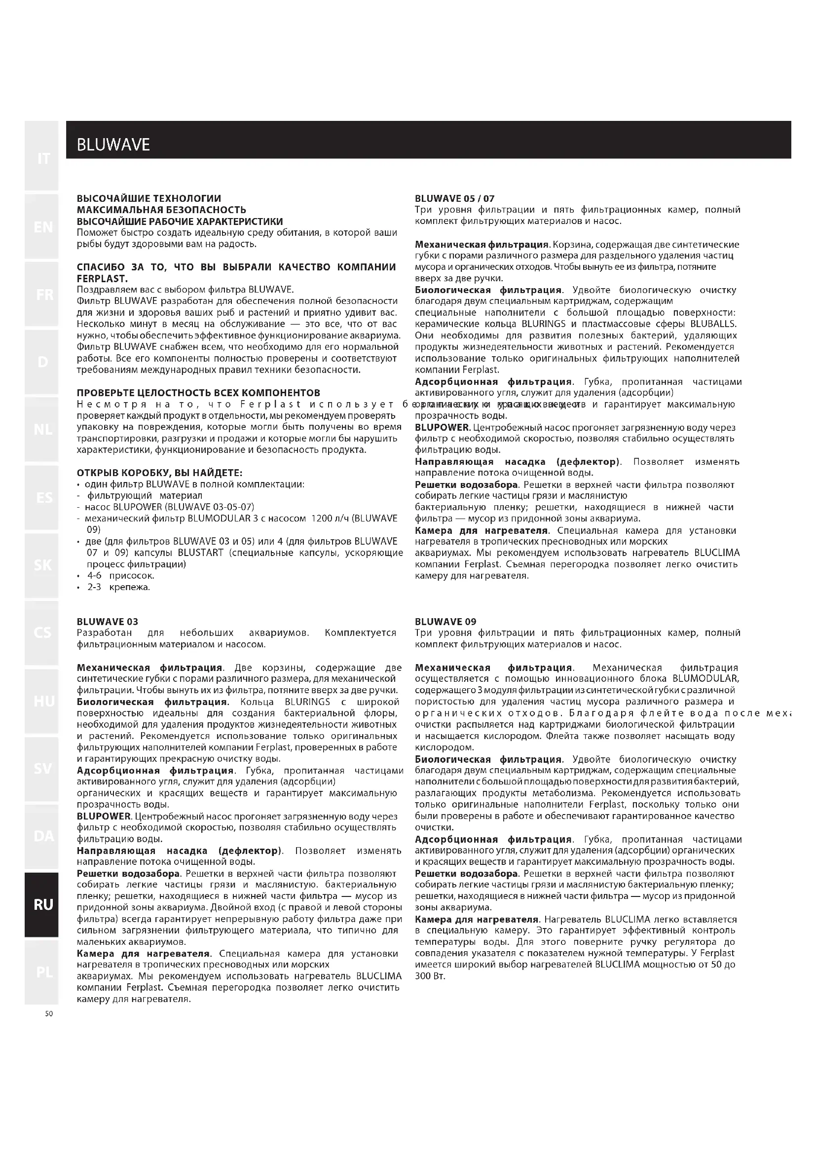 ВЫСОЧАЙШИЕ ТЕХНОЛОГИИ МАКСИМАЛЬНАЯ БЕЗОПАСНОСТЬ ВЫСОЧАЙШИЕ РАБОЧИЕ ХАРАКТЕРИСТИКИ Поможет быстро создать идеальную среду обитания, в которой ваши рыбы будут здоровыми вам на радость. СПАСИБО ЗА ТО, ЧТО ВЫ ВЫБРАЛИ КАЧЕСТВО КОМПАНИИ FERPLAST. Поздравляем вас с выбором фильтра BLUWAVE. Фильтр BLUWAVE разработан для обеспечения полной безопасности для жизни и здоровья ваших рыб и растений и приятно удивит вас. Несколько минут в месяц на обслуживание — это все, что от вас нужно, чтобы обеспечить эффективное функционирование аквариума. Фильтр BLUWAVE снабжен всем, что необходимо для его нормальной работы. Все его компоненты полностью проверены и соответствуют требованиям международных правил техники безопасности. ПРОВЕРЬТЕ ЦЕЛОСТНОСТЬ ВСЕХ КОМПОНЕНТОВ Несмотря на то, что Ferplast использует безопасную упаковку и проверяет каждый продукт в отдельности, мы рекомендуем проверять упаковку на повреждения, которые могли быть получены во время транспортировки, разгрузки и продажи и которые могли бы нарушить характеристики, функционирование и безопасность продукта. ОТКРЫВ КОРОБКУ, ВЫ НАЙДЕТЕ: