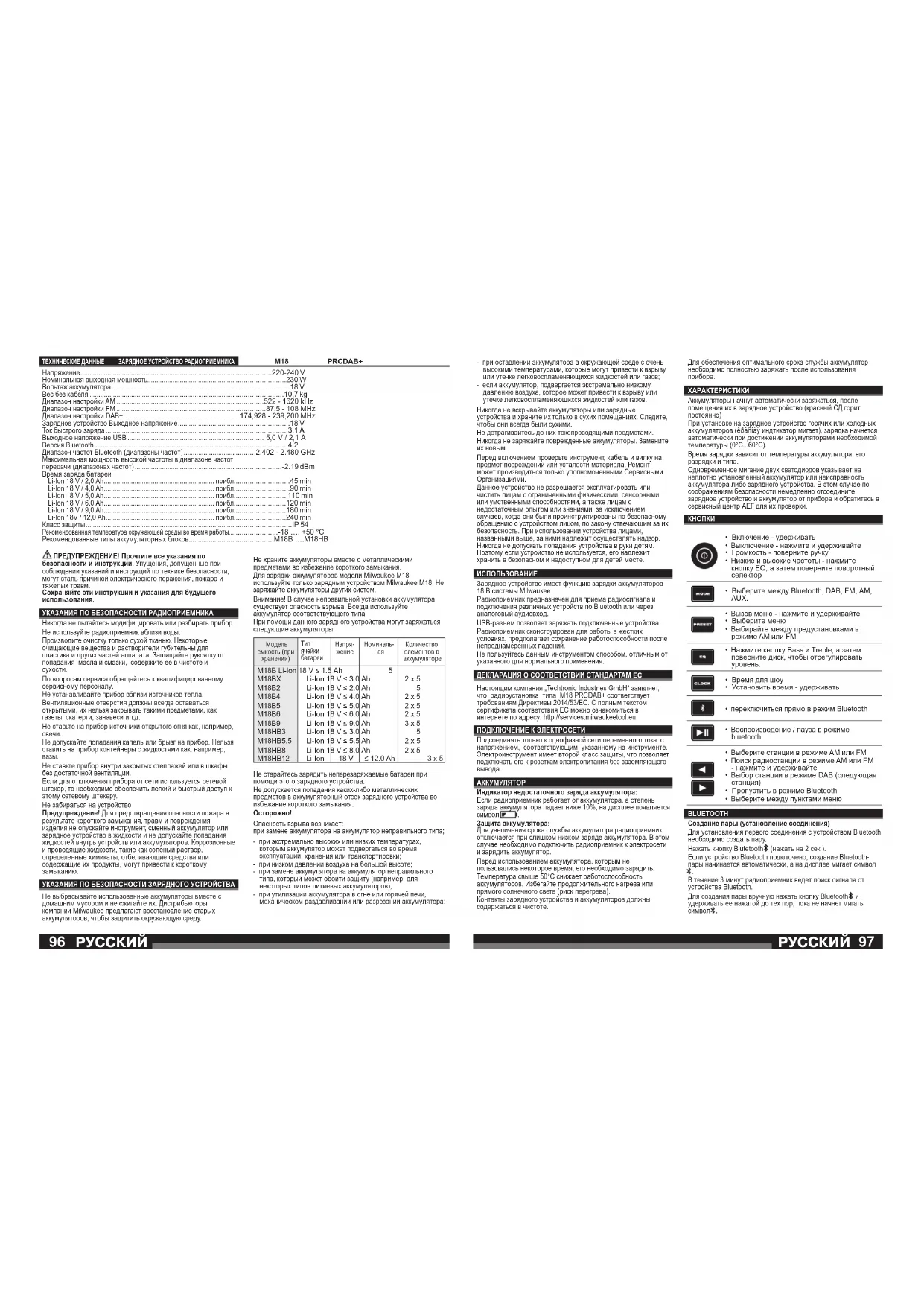 Перед включением проверьте инструмент, кабель и вилку на предмет повреждений или усталости материала. Ремонт может производиться только уполномоченными Сервисными Организациями. Данное устройство не разрешается эксплуатировать или чистить лицам с ограниченными физическими, сенсорными или умственными способностями, а также лицам с недостаточным опытом или знаниями, за исключением случаев, когда они были проинструктированы по безопасному обращению с устройством лицом, по закону отвечающим за их безопасность. При использовании устройства лицами, названными выше, за ними надлежит осуществлять надзор. Никогда не допускать попадания устройства в руки детям. Поэтому если устройство не используется, его надлежит хранить в безопасном и недоступном для детей месте. ИСПОЛЬЗОВАНИЕ Зарядное устройство имеет функцию зарядки аккумуляторов 18 В системы Milwaukee. Радиоприемник предназначен для приема радиосигнала и подключения различных устройств по Bluetooth или через аналоговый аудиовход. USB-разъем позволяет заряжать подключенные устройства. Радиоприемник сконструирован для работы в жестких условиях, предполагает сохранение работоспособности после непреднамеренных падений. Не пользуйтесь данным инструментом способом, отличным от указанного для нормального применения. ДЕКЛАРАЦИЯ О СООТВЕТСТВИИ СТАНДАРТАМ EC Настоящим компания „Techtronic Industries GmbH“ заявляет, что радиоустановка типа M18 PRCDAB+ соответствует требованиям Директивы 2014/53/ЕС. С полным текстом сертификата соответствия ЕС можно ознакомиться в интернете по адресу: http://services.milwaukeetool.eu ПОДКЛЮЧЕНИЕ К ЭЛЕКТРОСЕТИ Подсоединять только к однофазной сети переменного тока с напряжением, соответствующим указанному на инструменте. Электроинструмент имеет второй класс защиты, что позволяет подключать его к розеткам электропитания без заземляющего