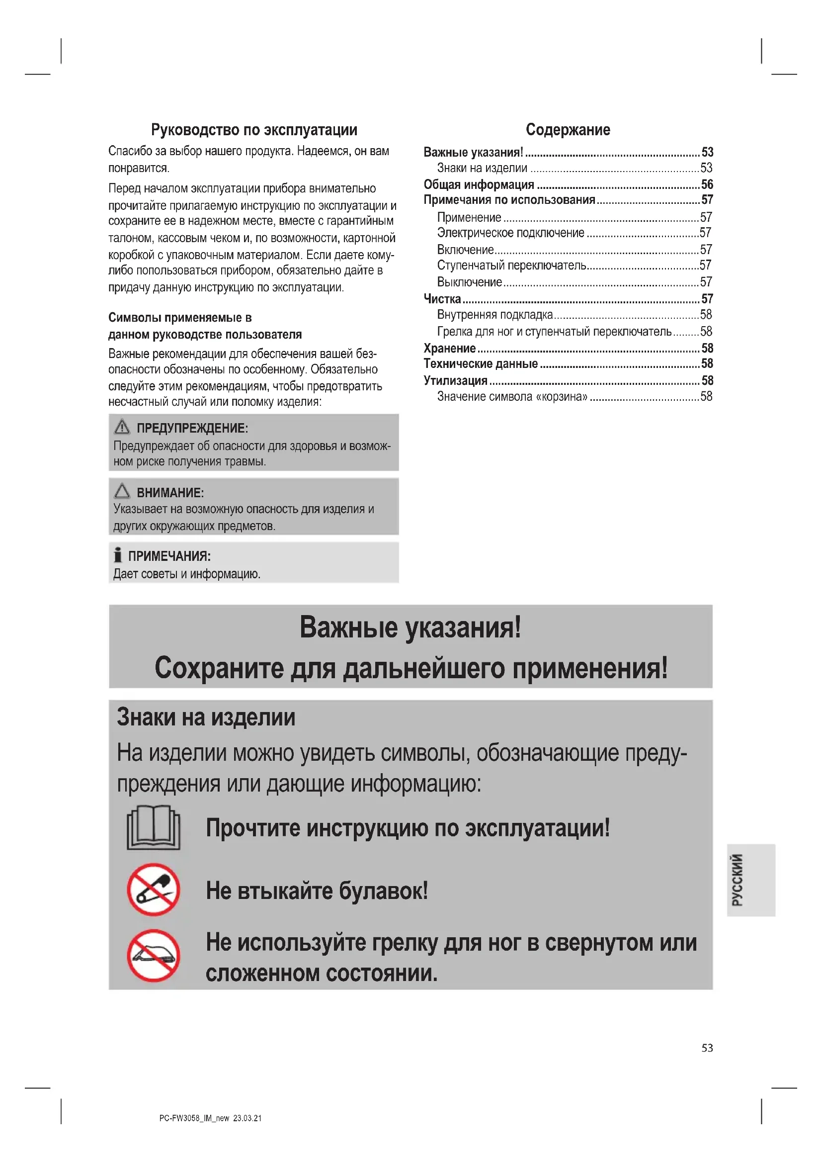 - Значение символа «корзина» Важные указания! Сохраните для дальнейшего применения! Знаки на изделии На изделии можно увидеть символы, обозначающие преду- преждения или дающие информацию: Прочтите инструкцию по эксплуатации! Не втыкайте булавок! Не используйте грелку для ног в свернутом или сложенном состоянии.PC-FW3058_IM_new 23.03.21 p. 58