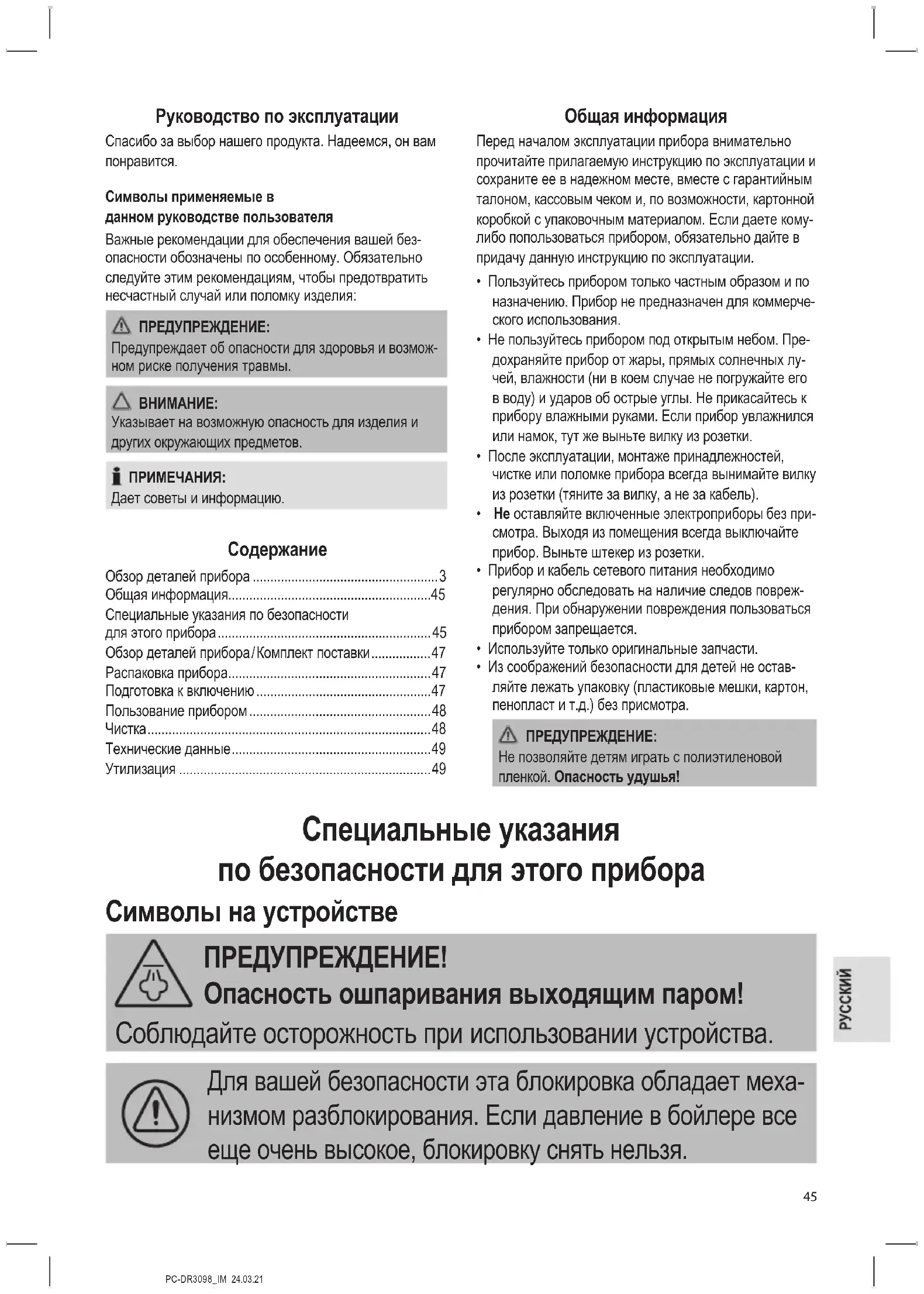 - Из соображений безопасности для детей не остав- ляйте лежать упаковку (пластиковые мешки, картон, пенопласт и т.д.) без присмотра. ПРЕДУПРЕЖДЕНИЕ: Не позволяйте детям играть с полиэтиленовой пленкой. Опасность удушья! Специальные указания по безопасности для этого прибора Символы на устройстве ПРЕДУПРЕЖДЕНИЕ! Опасность ошпаривания выходящим паром! Соблюдайте осторожность при использовании устройства. Для вашей безопасности эта блокировка обладает меха- низмом разблокирования. Если давление в бойлере все еще очень высокое, блокировку снять нельзя.PC-DR3098_IM 24.03.21