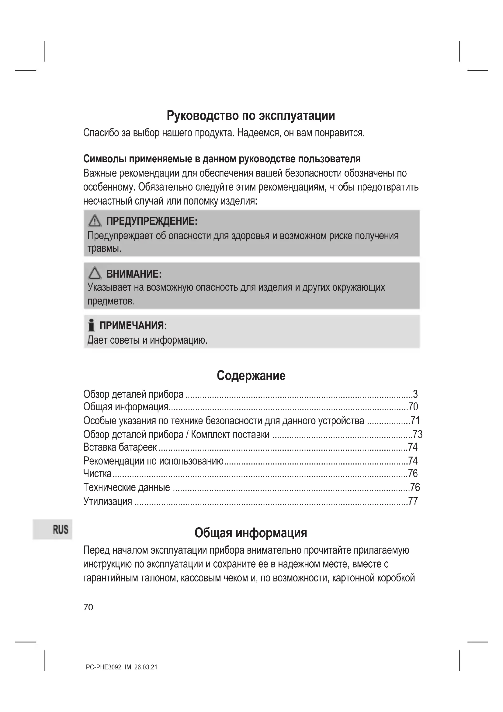 - Утилизация Общая информация Перед началом эксплуатации прибора внимательно прочитайте прилагаемую инструкцию по эксплуатации и сохраните ее в надежном месте, вместе с гарантийным талоном, кассовым чеком и, по возможности, картонной коробкой71 PC-PHE3092_IM 26.03.21 с упаковочным материалом. Если даете кому- либо попользоваться прибором, обязательно дайте в придачу данную инструкцию по эксплуатации. p. 77