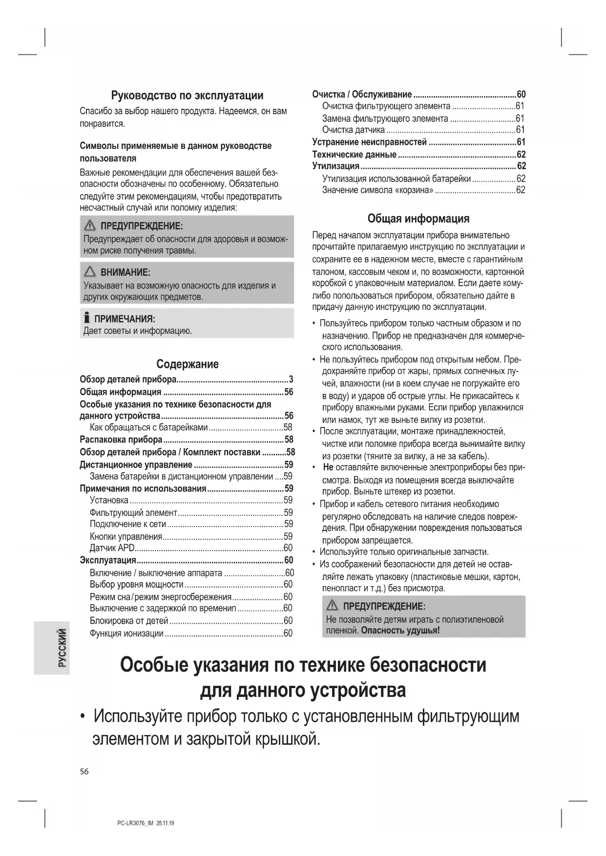 - Используйте прибор только с установленным фильтрующим элементом и закрытой крышкой.PC-LR3076_IM 28.11.19
