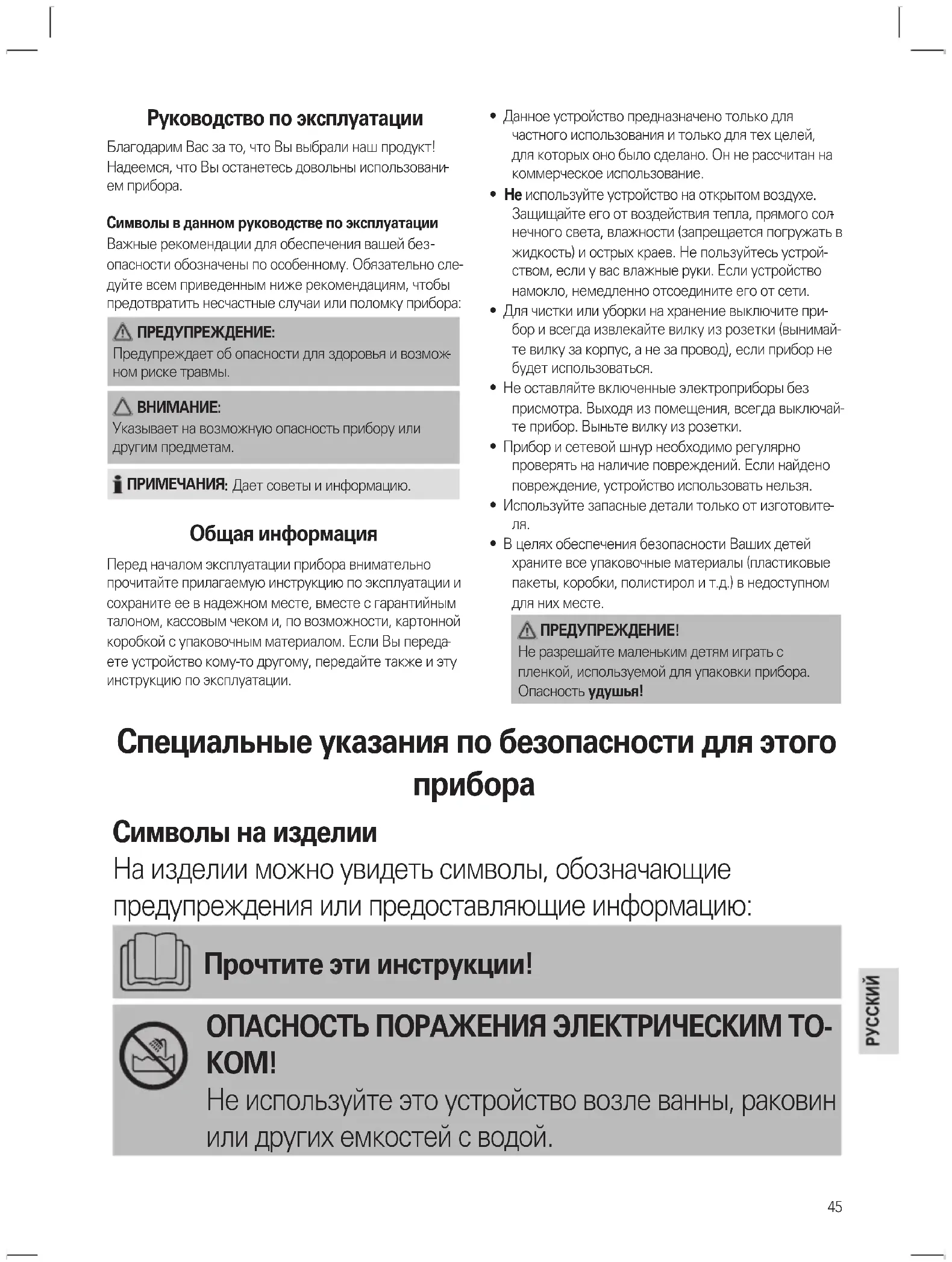 - В целях обеспечения безопасности Ваших детей храните все упаковочные материалы (пластиковые пакеты, коробки, полистирол и т.д.) в недоступном для них месте. ПРЕДУПРЕЖДЕНИЕ! Не разрешайте маленьким детям играть с пленкой, используемой для упаковки прибора. Опасность удушья! Специальные указания по безопасности для этого