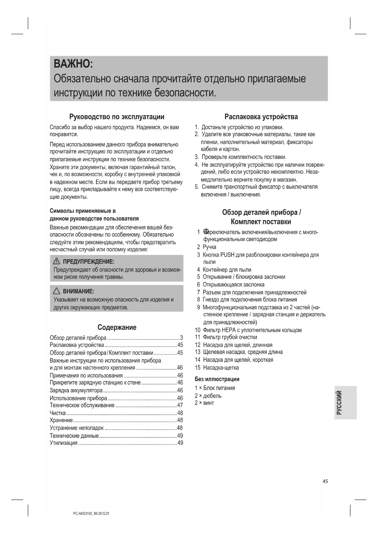 4 Контейнер для пыли 5 Открывание / блокировка заслонки 6 Открывающаяся заслонка 7 Разъем для подключения принадлежностей 8 Гнездо для подключения блока питания 9 Многофункциональная подставка из 2 частей (на- стенное крепление / зарядная станция и держатель для принадлежностей) 10 Фильтр HEPA с уплотнительным кольцом 11 Фильтр грубой очистки 12 Насадка для щелей, длинная 13 Щелевая насадка, средняя длина 14 Насадка для щелей, короткая 15 Насадка-щетка Без иллюстрации 1 × Блок питания 2 × дюбель 2 × винтPC-AKS3102_IM 29.12.21