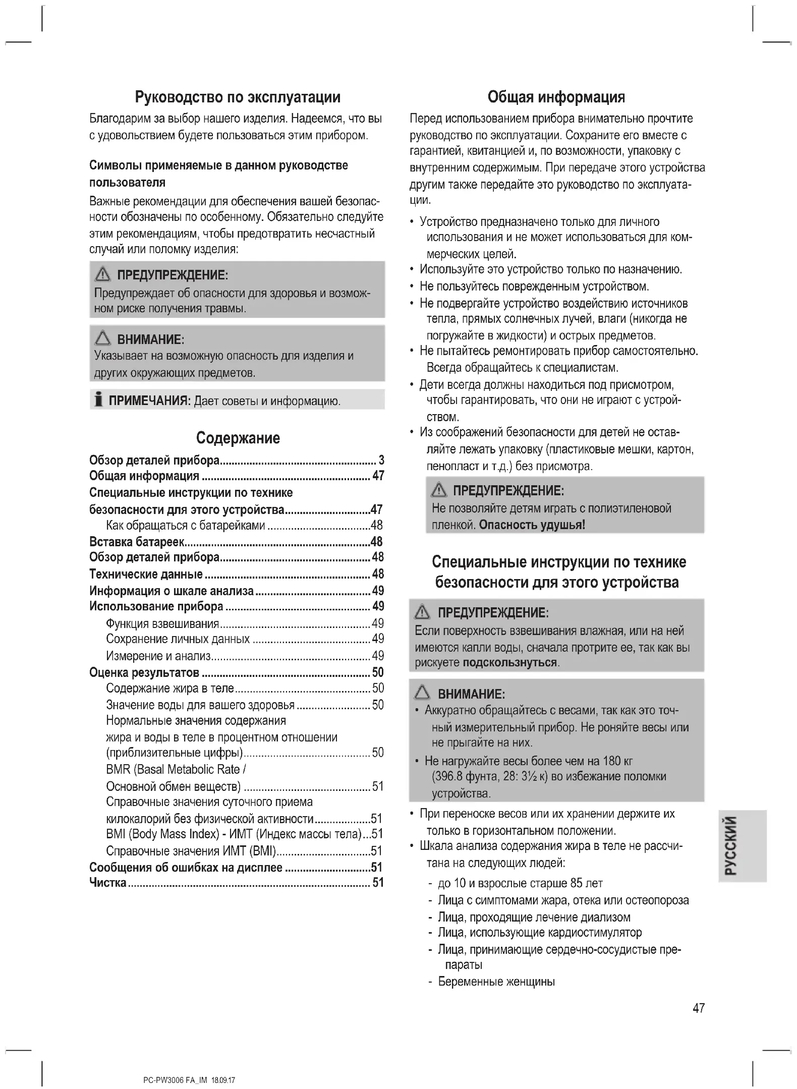 - Из-за значительной флуктуации содержания жира в теле стандартное значение получить трудно. Таким образом, для получения постоянных данных всегда выполняйте измерения в одно и то же время суток.50 PC-PW3006 FA_IM 18.09.17 ПРИМЕЧАНИЯ: