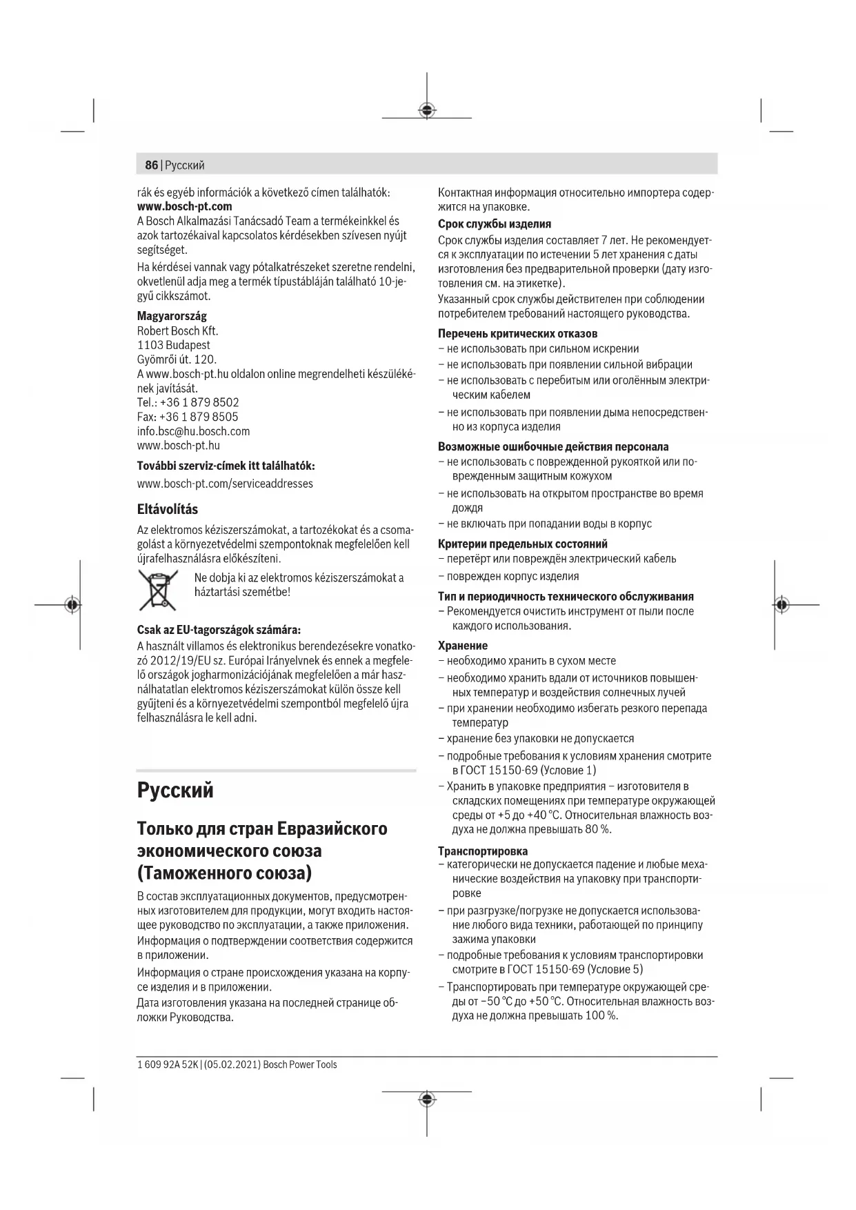 Отслужившие свой срок электроинструменты, принад- лежности и упаковку следует сдавать на экологически чи- стую рекуперацию отходов. Утилизируйте электроинструмент отдельно от бытового мусора! 1 609 92A 52K | (05.02.2021) Bosch Power ToolsУкраїнська | 93 Только для стран-членовЕС: В соответствии с Европейской директивой 2012/19/EU об отработанных электрических и электронных приборах и ее преобразованием в национальное законодательство негодные электроприборы нужно собирать отдельно и сдавать на экологически чистую переработку.