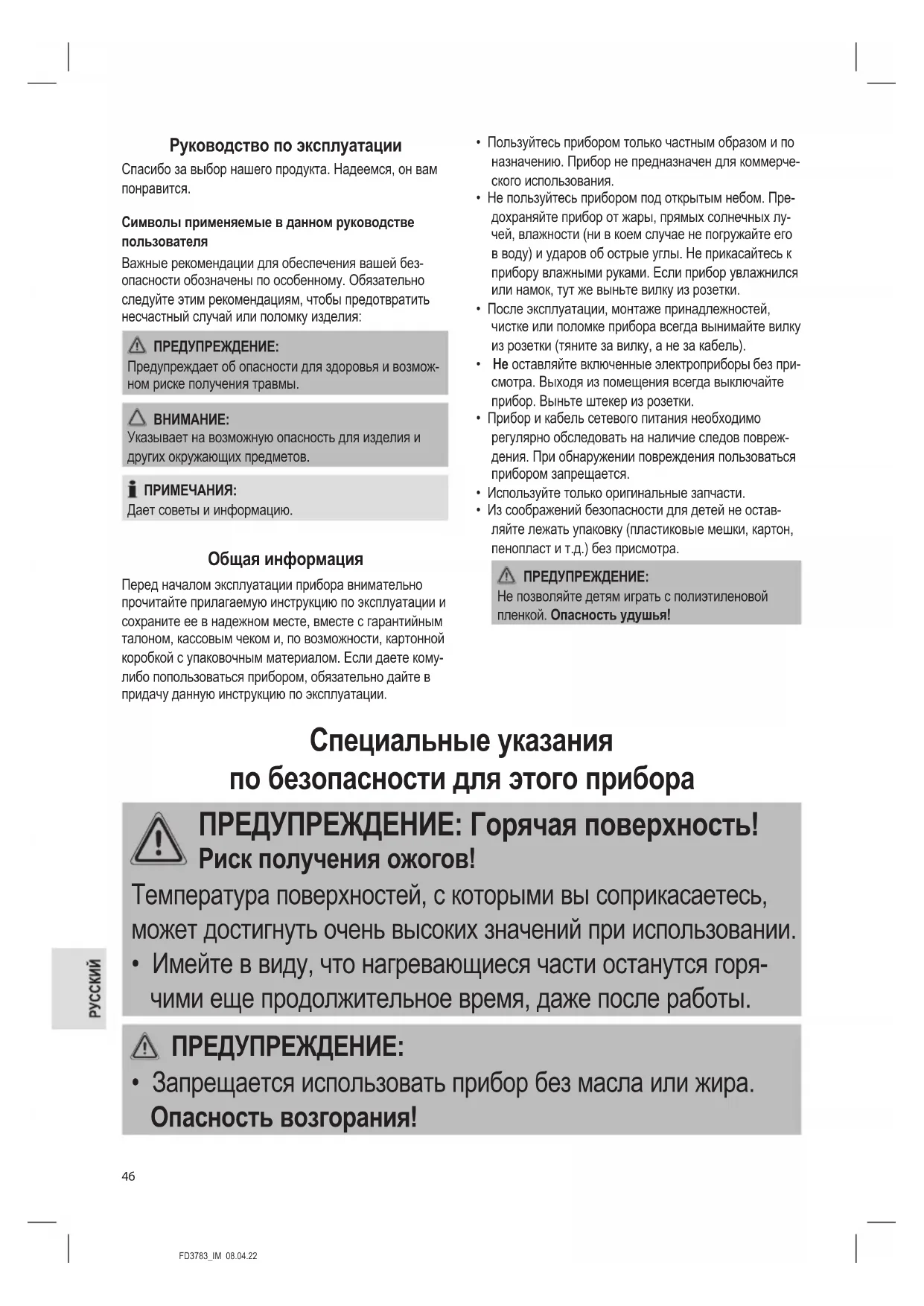 - Запрещается использовать прибор без масла или жира. Опасность возгорания!FD3783_IM 08.04.22