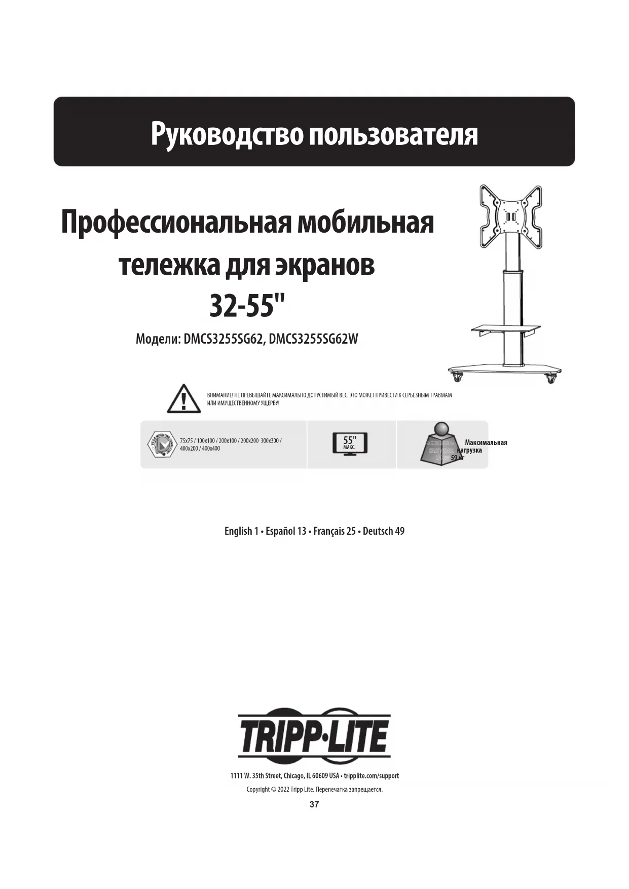 - Pour toute question, visiter tripplite.com/support. Réglage37 Руководство пользователя Профессиональная мобильная тележка для экранов 32-55" Модели: DMCS3255SG62, DMCS3255SG62W 1111 W. 35th Street, Chicago, IL 60609 USA • tripplite.com/support Copyright © 2022 Tripp Lite. Перепечатка запрещается. ВНИМАНИЕ! НЕ ПРЕВЫШАЙТЕ МАКСИМАЛЬНО ДОПУСТИМЫЙ ВЕС. ЭТО МОЖЕТ ПРИВЕСТИ К СЕРЬЕЗНЫМ ТРАВМАМ ИЛИ ИМУЩЕСТВЕННОМУ УЩЕРБУ!75x75 / 100x100 / 200x100 / 200x200 300x300 / 400x200 / 400x400 55" Максимальная Максимальная нагрузка нагрузка 59 кг 59 кг English 1 • Español 13 • Français 25 • Deutsch 4938 Указания по технике безопасности Гарантийные обязательства Примечание. Перед началом установки и сборки модуля внимательно изучите все разделы руководства.