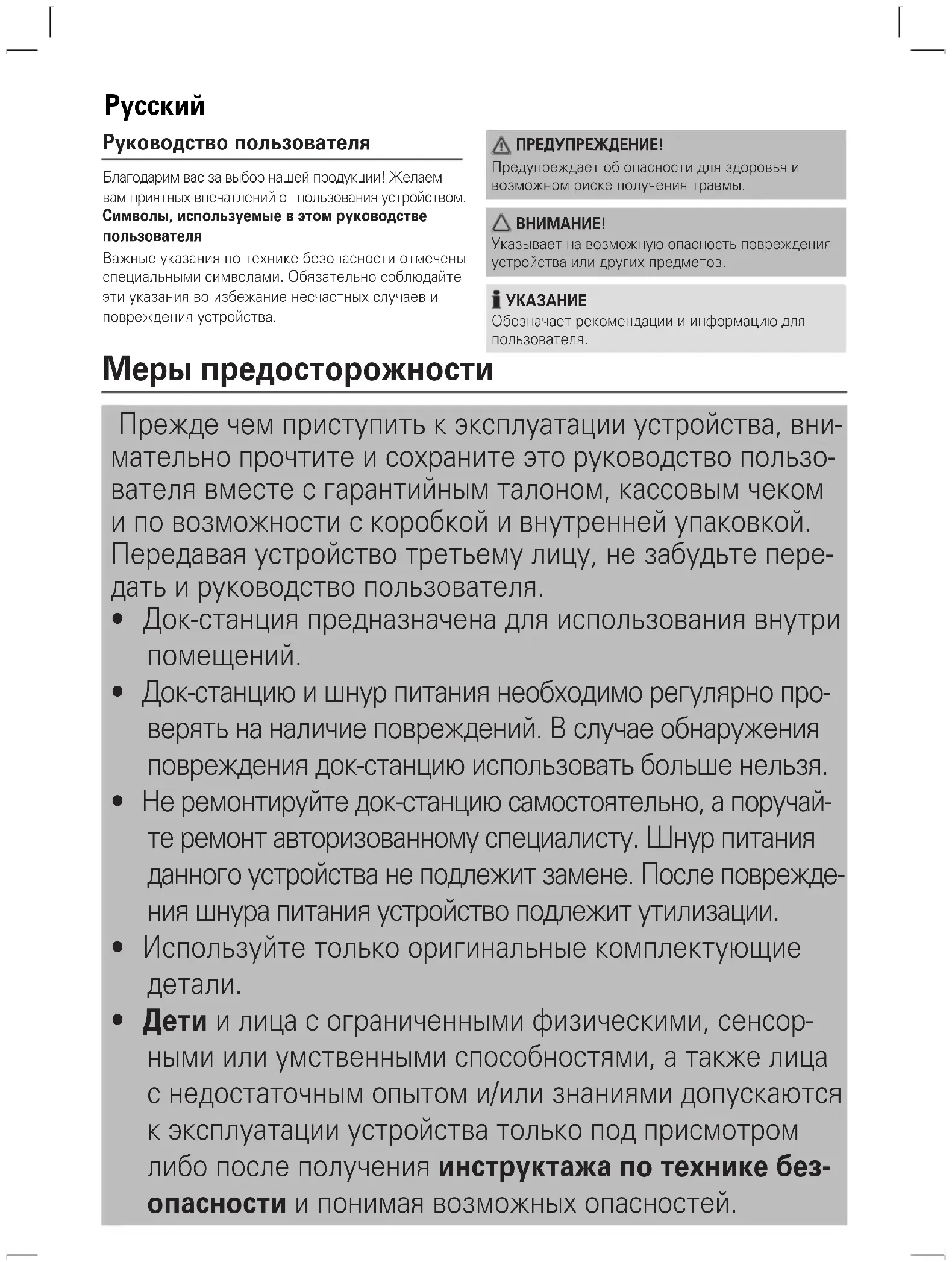 - Неремонтируйтедок-станциюсамостоятельно,апоручай- те ремонт авторизованному специалисту. Шнур питания данного устройства не подлежит замене. После поврежде- ния шнура питания устройство подлежит утилизации.