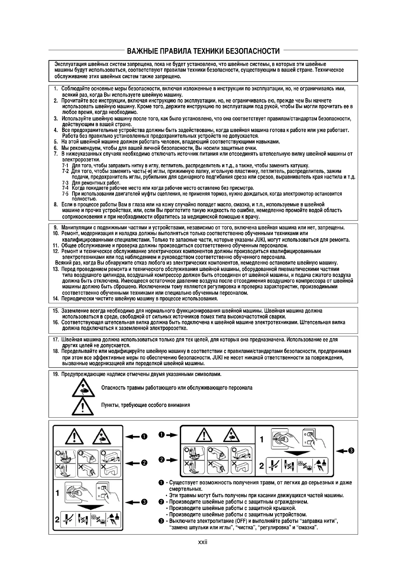 - Volan kasnağı, sadece dikiş makinesi tamamen durduktan sonra çevirin. UYARI : Makinenin arızalanmasını ve hasar görmesini önlemek için; aşağıdaki işlemleri uygulayınız:xxii ВАЖНЫЕ ПРАВИЛА ТЕХНИКИ БЕЗОПАСНОСТИ Эксплуатация швейных систем запрещена, пока не будет установлено, что швейные системы, в которых эти швейные машины будут использоваться, соответствуют правилам техники безопасности, существующим в вашей стране. Техническое обслуживание этих швейных систем также запрещено.