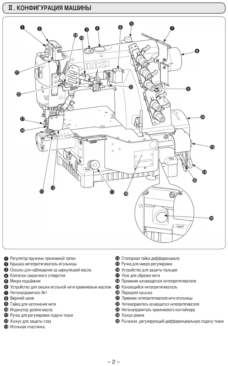 . КОНФИГУРАЦИЯ МАШИНЫ Регулятор пружины прижимной лапки Стопорная гайка дифференциала Крышка нитепритягиватель игольницы Ручка для микро-регулировки Окошко для наблюдения за циркуляцией масла Устройство для защиты пальцев Колпачок смазочного отверстия Нож для обрезки нити 5 Микро-подъёмник!8 Приемник качающегося нитепритягивателя Устройство для смазки игольной нити кремниевым маслом !9 Качающийся нитепритягиватель7Нитенаправитель №1@0 Передняя крышка8 Верхний шкив Приемник нитепритягивателя нити игольницы Гайка для натяжения нити Нитенаправитель качающегося нитепритягивателя Индикатор уровня масла Нитенаправитель кремниевого контейнера Ручка для регулировки подачи ткани @4Кожух ремня!2 Кожух для защиты глаз Рычажок, регулирующий дифференциальную подачу ткани Игольная пластинка 123456789!0!1!2!3!4!5!6!7!8!9@4@0@2@1@3@5