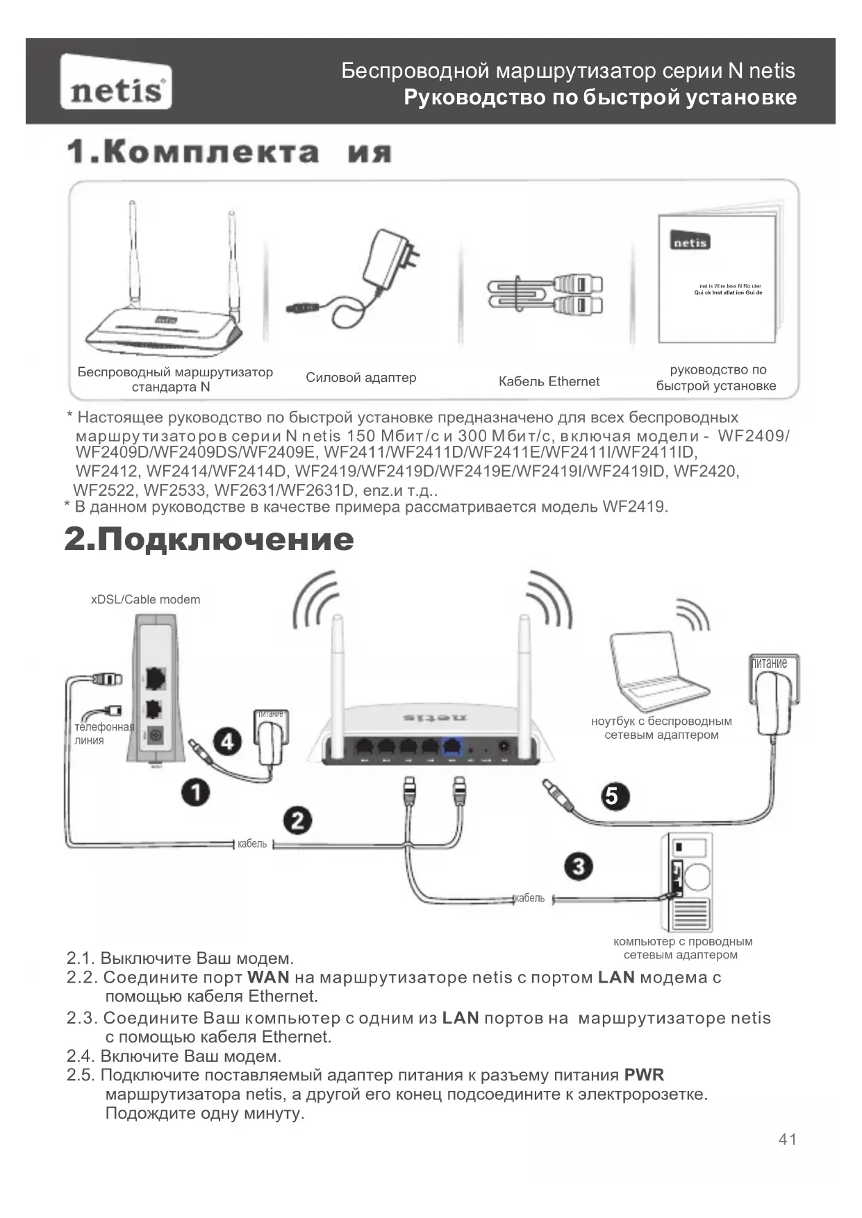 - Настоящее руководство по быстрой установке предназначено для всех беспроводных маршрутизаторов серии N netis 150 Мбит/с и 300 Мбит/с, включая модели - WF2409/ WF2409D/WF2409DS/WF2409E, WF2411/WF2411D/WF2411E/WF2411I/WF2411ID, WF2412, WF2414/WF2414D, WF2419/WF2419D/WF2419E/WF2419I/WF2419ID, WF2420, WF2522, WF2533, WF2631/WF2631D, enz.и т.д..
