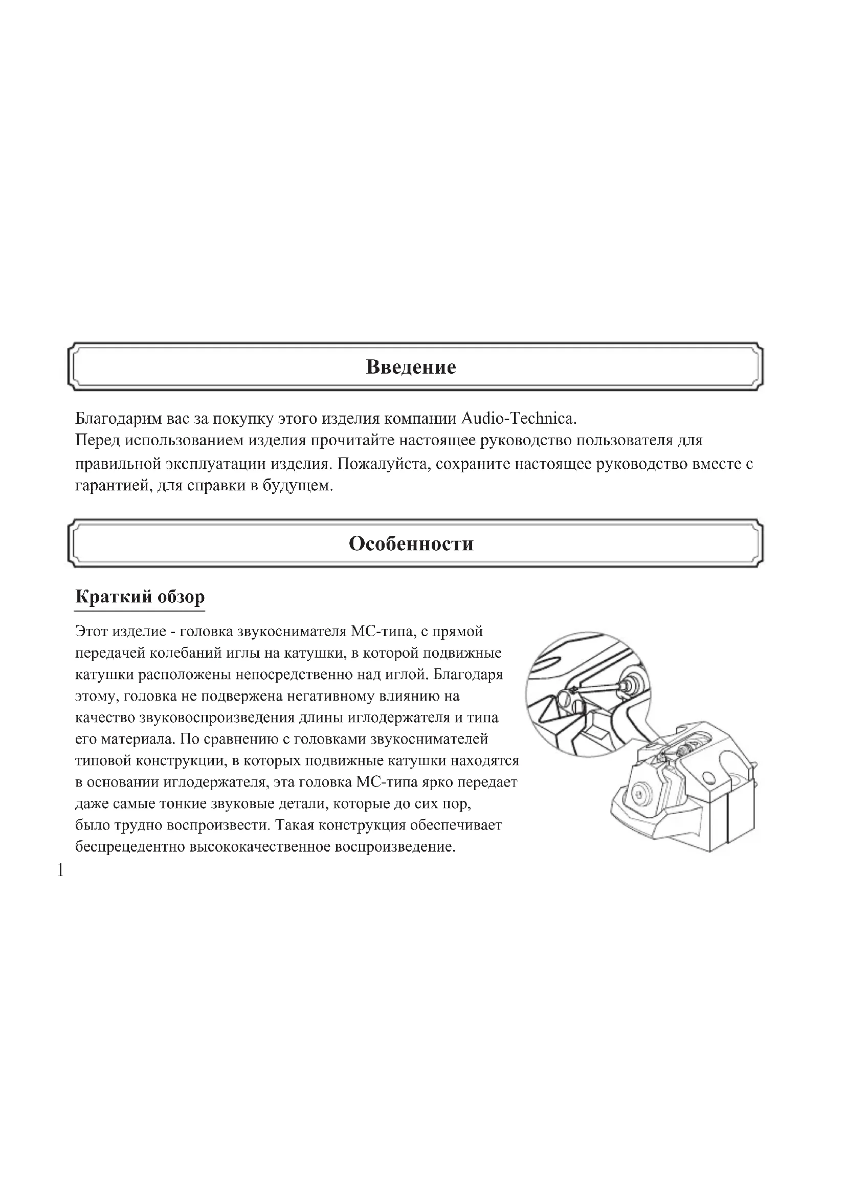 Особенности Благодарим вас за покупку этого изделия компании Audio-Technica. Перед использованием изделия прочитайте настоящее руководство пользователя для правильной эксплуатации изделия. Пожалуйста, сохраните настоящее руководство вместе с гарантией, для справки в будущем. Краткий обзор Этот изделие - головка звукоснимателя MC-типа, с прямой передачей колебаний иглы на катушки, в которой подвижные катушки расположены непосредственно над иглой. Благодаря этому, головка не подвержена негативному влиянию на качество звуковоспроизведения длины иглодержателя и типа его материала. По сравнению с головками звукоснимателей типовой конструкции, в которых подвижные катушки находятся в основании иглодержателя, эта головка MC-типа ярко передает даже самые тонкие звуковые детали, которые до сих пор, было трудно воспроизвести. Такая конструкция обеспечивает беспрецедентно высококачественное воспроизведение.2