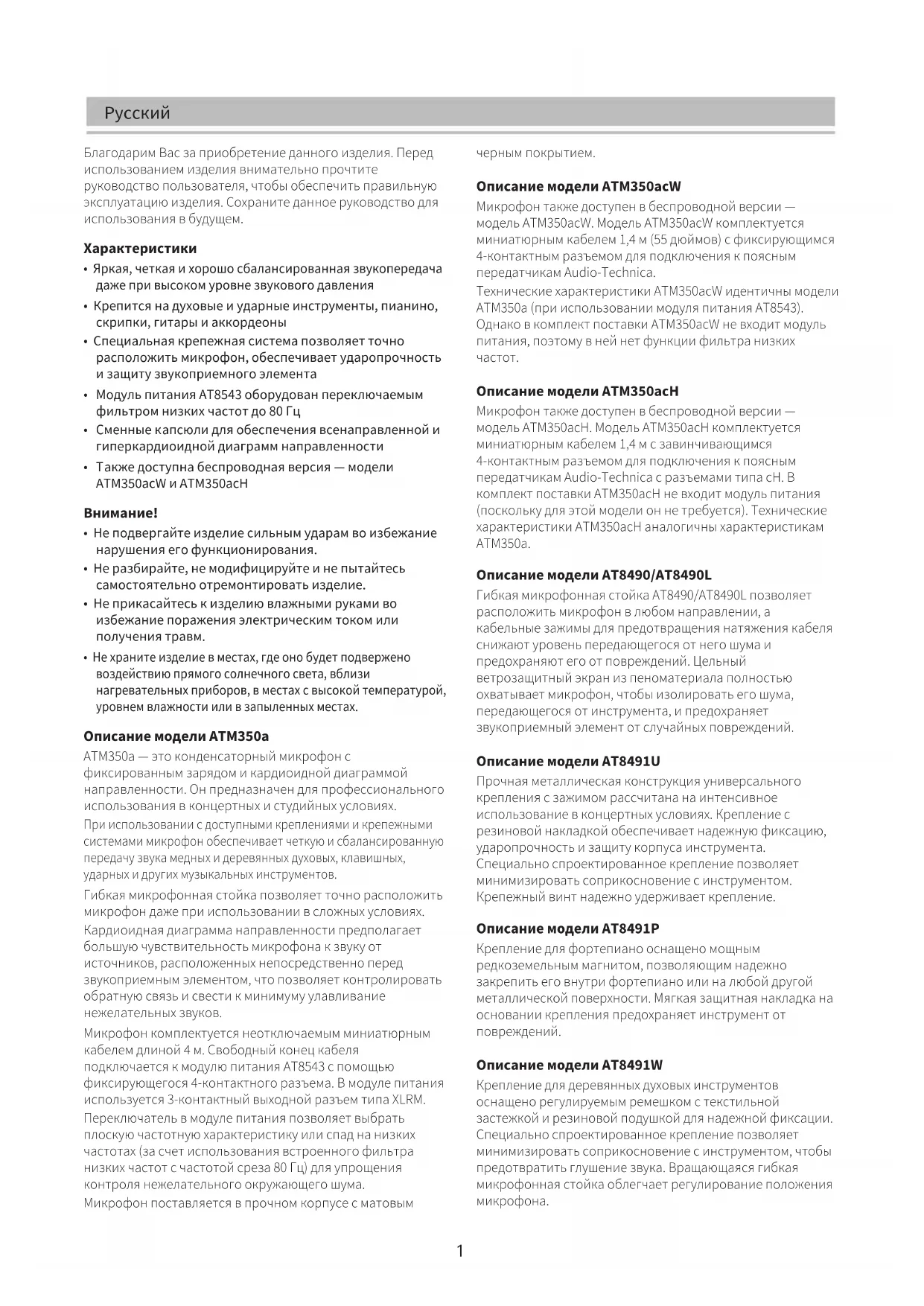 Описание модели ATM350acH Микрофон также доступен в беспроводной версии — модель ATM350acH. Модель ATM350acH комплектуется миниатюрным кабелем 1,4 м с завинчивающимся 4-контактным разъемом для подключения к поясным передатчикам Audio-Technica с разъемами типа cH. В комплект поставки ATM350acH не входит модуль питания (поскольку для этой модели он не требуется). Технические характеристики ATM350acH аналогичны характеристикам ATM350a. Описание модели AT8490/AT8490L Гибкая микрофонная стойка AT8490/AT8490L позволяет расположить микрофон в любом направлении, а кабельные зажимы для предотвращения натяжения кабеля снижают уровень передающегося от него шума и предохраняют его от повреждений. Цельный ветрозащитный экран из пеноматериала полностью охватывает микрофон, чтобы изолировать его шума, передающегося от инструмента, и предохраняет звукоприемный элемент от случайных повреждений. Описание модели AT8491U Прочная металлическая конструкция универсального крепления с зажимом рассчитана на интенсивное использование в концертных условиях. Крепление с резиновой накладкой обеспечивает надежную фиксацию, ударопрочность и защиту корпуса инструмента. Специально спроектированное крепление позволяет минимизировать соприкосновение с инструментом. Крепежный винт надежно удерживает крепление. Описание модели AT8491P Крепление для фортепиано оснащено мощным редкоземельным магнитом, позволяющим надежно закрепить его внутри фортепиано или на любой другой металлической поверхности. Мягкая защитная накладка на основании крепления предохраняет инструмент от повреждений. Описание модели AT8491W Крепление для деревянных духовых инструментов оснащено регулируемым ремешком с текстильной застежкой и резиновой подушкой для надежной фиксации. Специально спроектированное крепление позволяет минимизировать соприкосновение с инструментом, чтобы предотвратить глушение звука. Вращающаяся гибкая микрофонная стойка облегчает регулирование положения