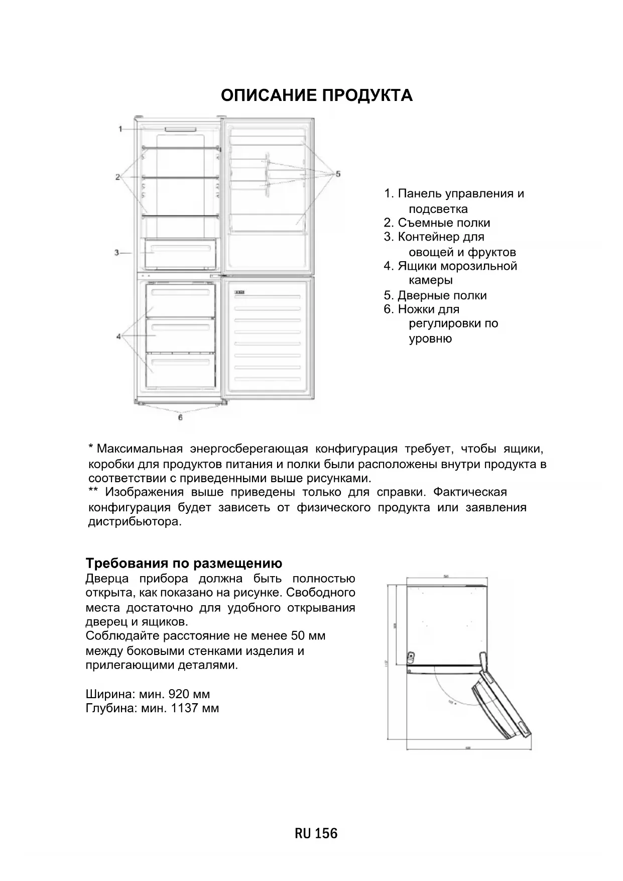 - Максимальная энергосберегающая конфигурация требует, чтобы ящики, коробки для продуктов питания и полки были расположены внутри продукта в соответствии с приведенными выше рисунками. ** Изображения выше приведены только для справки. Фактическая конфигурация будет зависеть от физического продукта или заявления дистрибьютора. Требования по размещению Дверца прибора должна быть полностью открыта, как показано на рисунке. Свободного места достаточно для удобного открывания дверец и ящиков. Соблюдайте расстояние не менее 50 мм между боковыми стенками изделия и прилегающими деталями. Ширина: мин. 920 мм Глубина: мин. 1137 ммИСПОЛЬЗОВАНИЕ ➀ Кнопка ВКЛ/ВЫКЛ, используемая для включения/выключения прибора. ➁ Кнопка Mode, используемая для выбора температуры холодильного отсека или специальных функций. ➂ Значок Wi-Fi показывает, подключено ли устройство к приложению. ➃ Значок Super Cool показывает, активирована ли функция. ➄ Уровни температуры, показывающие, какая температура выбрана. Использование
