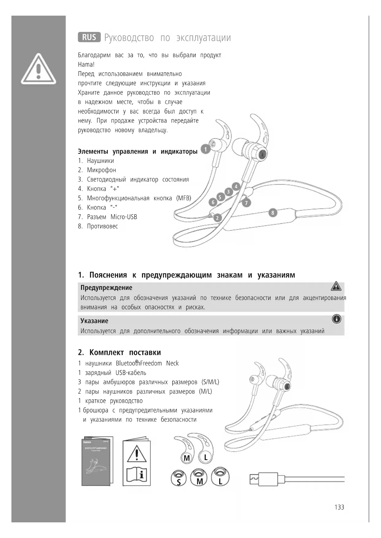 Freedom Neck 1 зарядный USB-кабель 3 пары амбушюров различных размеров (S/M/L) 2 пары наушников различных размеров (M/L) 1 краткое руководство