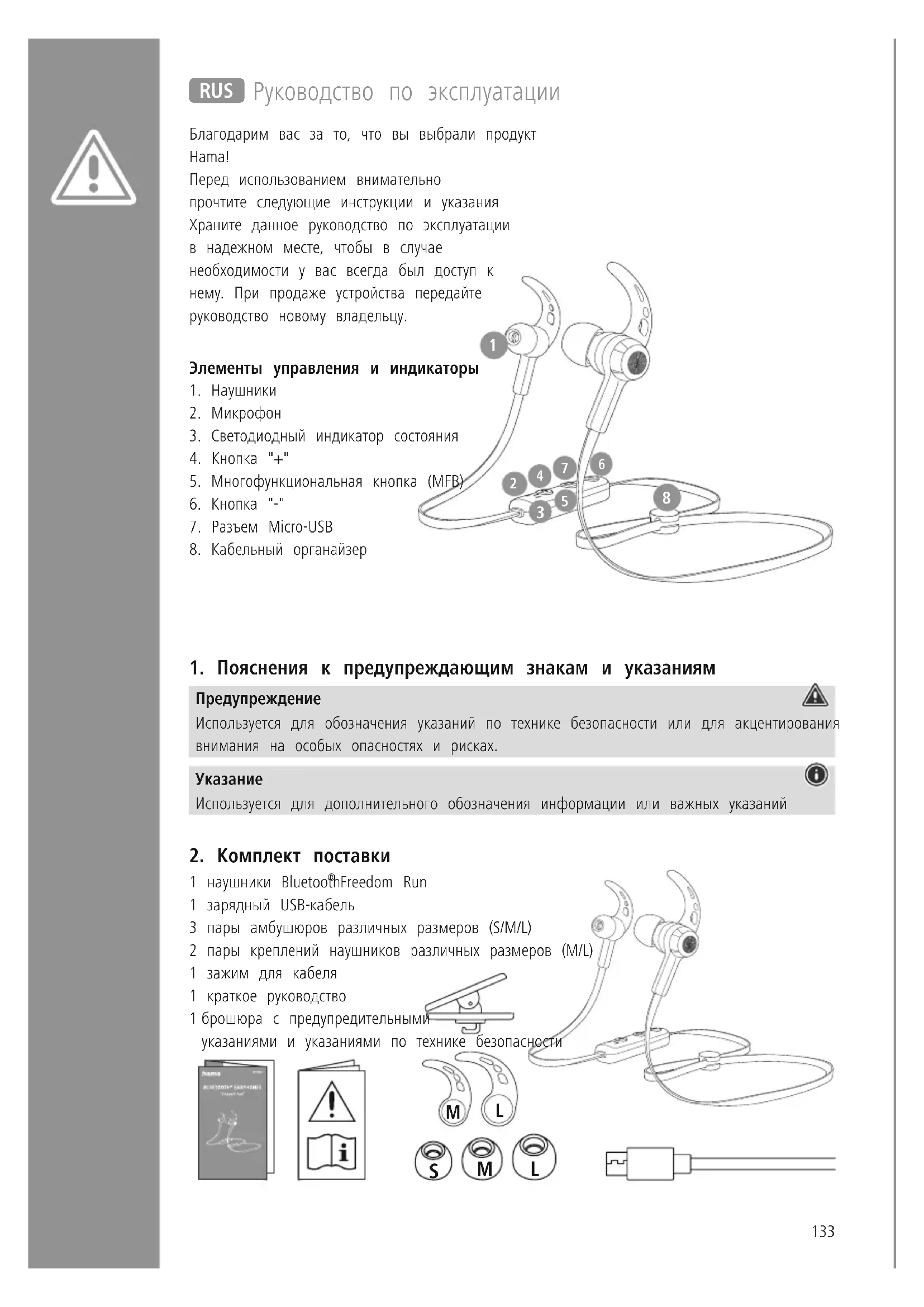 Freedom Run 1 зарядный USB-кабель 3 пары амбушюров различных размеров (S/M/L) 2 пары креплений наушников различных размеров (M/L) 1 зажим для кабеля 1 краткое руководство