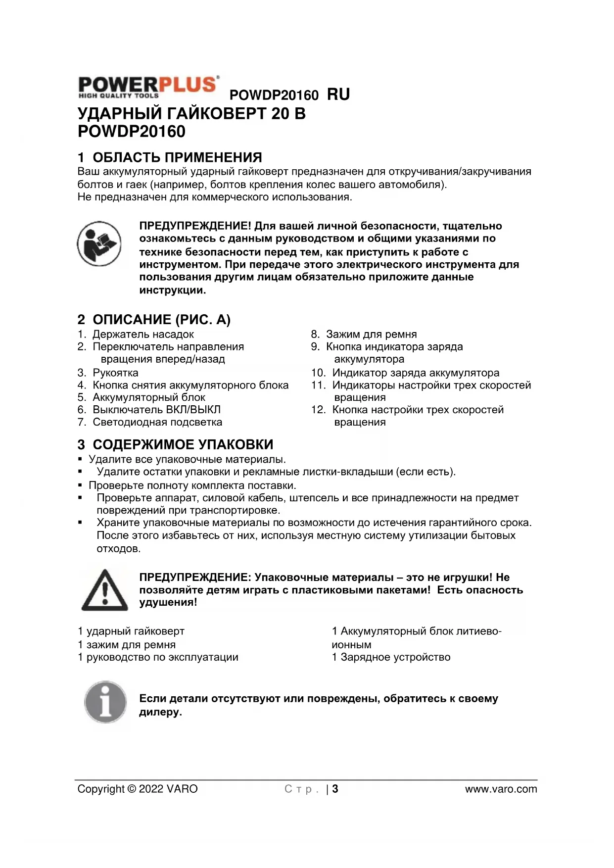 - 15 ДЕКЛАРАЦИЯ О СООТВЕТСТВИИ POWDP20160 RU Copyright © 2022 VARO С т р . | 3 www.varo.com УДАРНЫЙ ГАЙКОВЕРТ 20 В POWDP20160 1 ОБЛАСТЬ ПРИМЕНЕНИЯ Ваш аккумуляторный ударный гайковерт предназначен для откручивания/закручивания болтов и гаек (например, болтов крепления колес вашего автомобиля). Не предназначен для коммерческого использования. ПРЕДУПРЕЖДЕНИЕ! Для вашей личной безопасности, тщательно ознакомьтесь с данным руководством и общими указаниями по технике безопасности перед тем, как приступить к работе с инструментом. При передаче этого электрического инструмента для пользования другим лицам обязательно приложите данные инструкции. 2 ОПИСАНИЕ (РИС. А) p. 15