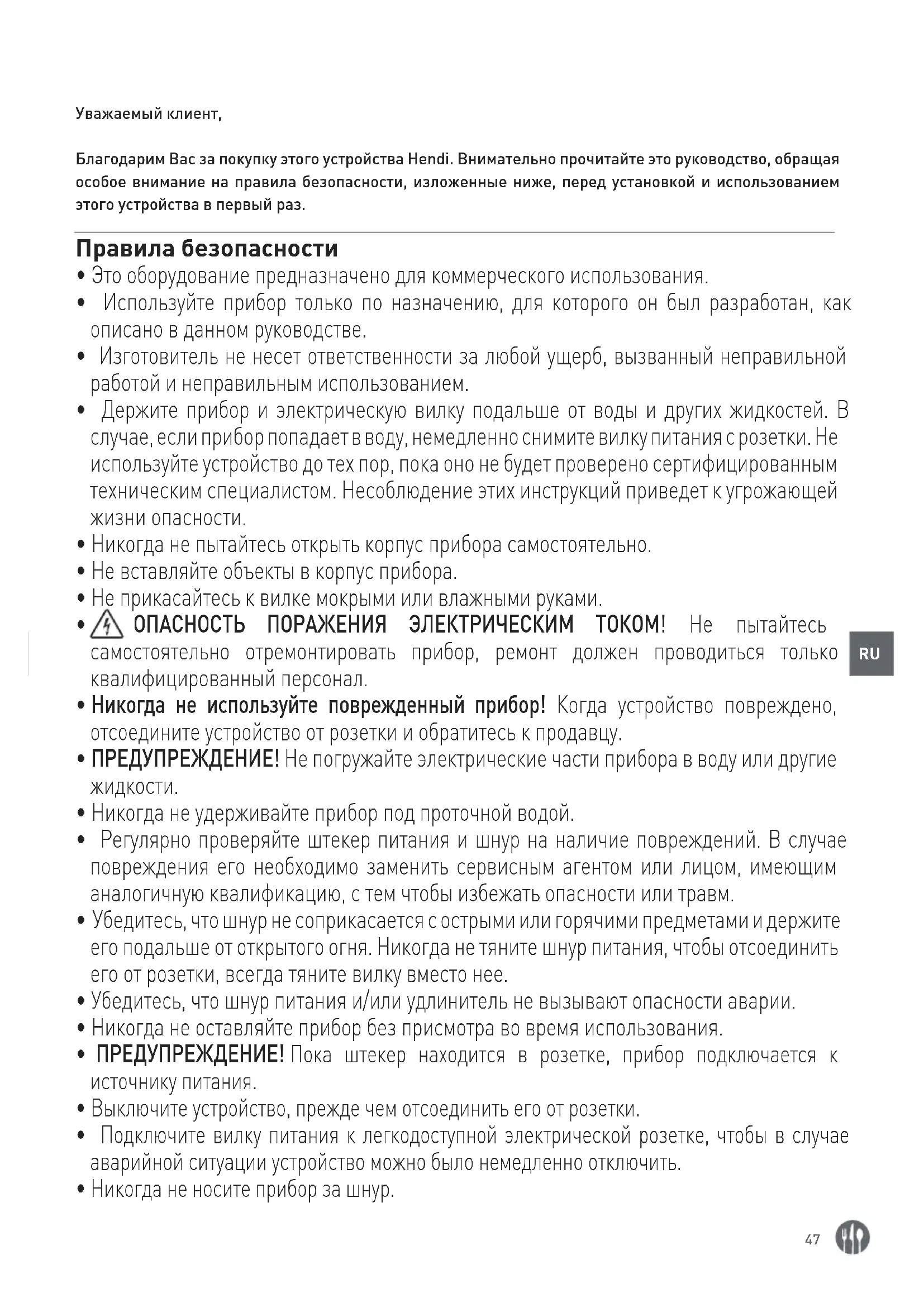 Уважаемый клиент, Благодарим Вас за покупку этого устройства Hendi. Внимательно прочитайте это руководство, обращая особое внимание на правила безопасности, изложенные ниже, перед установкой и использованием этого устройства в первый раз. Правила безопасности