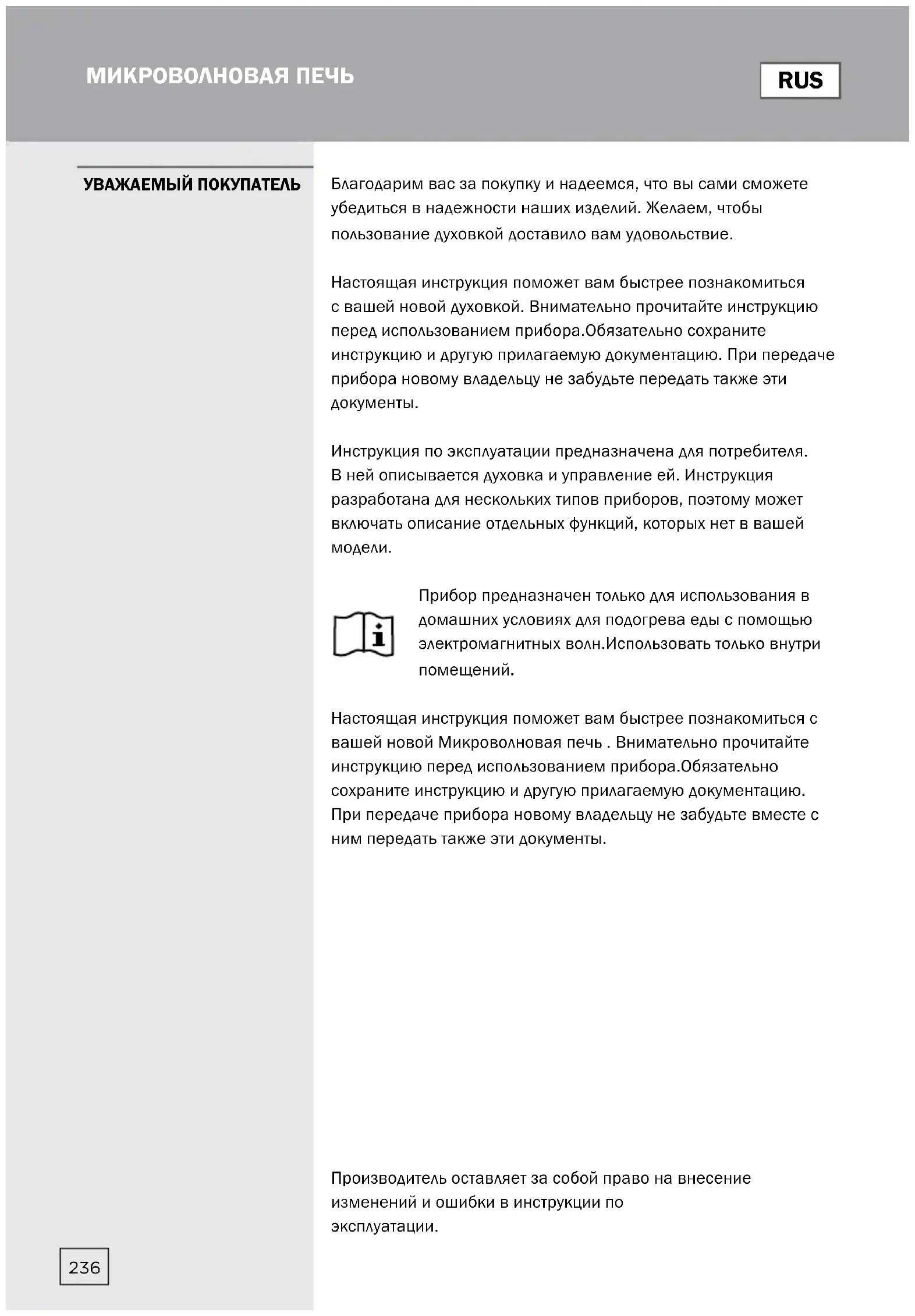 Настоящая инструкция поможет вам быстрее познакомиться с вашей новой Микроволновая печь . Внимательно прочитайте инструкцию перед использованием прибора.Обязательно сохраните инструкцию и другую прилагаемую документацию. При передаче прибора новому владельцу не забудьте вместе с ним передать также эти документы. Производитель оставляет за собой право на внесение изменений и ошибки в инструкции по эксплуатации. УВАЖАЕМЫЙ ПОКУПАТЕЛЬ RUS МИКРОВОЛНОВАЯ ПЕЧЬ237 Не прикасайтесь к поверхностям приборов и их нагревательным элементам во время приготовления. При работе поверхности нагреваются. Держите детей на безопасном расстоянии. Есть риск возникновения ожогов. Источник микроволновой энергии. Высокое напряжение. Не снимать крышку. Внимание прибор и его детали нагреваются во время использования. Будьте осторожны, не дотрагивайтесь до нагревательных элементов. Детям, младше 8 лет, запрещается пользоваться данным прибором без постоянного контроля взрослых. Следите за тем, чтобы дети не играли с прибором. Этим прибором могут пользоваться дети, старше 8 лет; лица с ограниченными физическими, чувствительными и умственными способностями; лица, не имеющие опыта работы с устройством и не знающие как им пользоваться только под контролем и руководством лиц, обеспечивающих безопасное использование и связанных с ним рисков. Следите, чтобы дети не играли с прибором. Чистка и обслуживание не должны проводиться детьми младше 8 лет, либо под контролем взрослых. Храните прибор и его сетевой шнур в недоступном для детей месте.