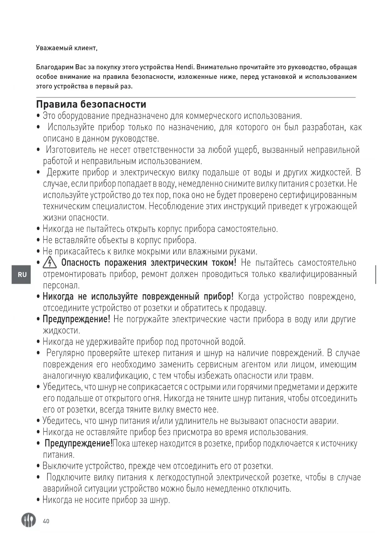 Уважаемый клиент, Благодарим Вас за покупку этого устройства Hendi. Внимательно прочитайте это руководство, обращая особое внимание на правила безопасности, изложенные ниже, перед установкой и использованием этого устройства в первый раз. Правила безопасности
