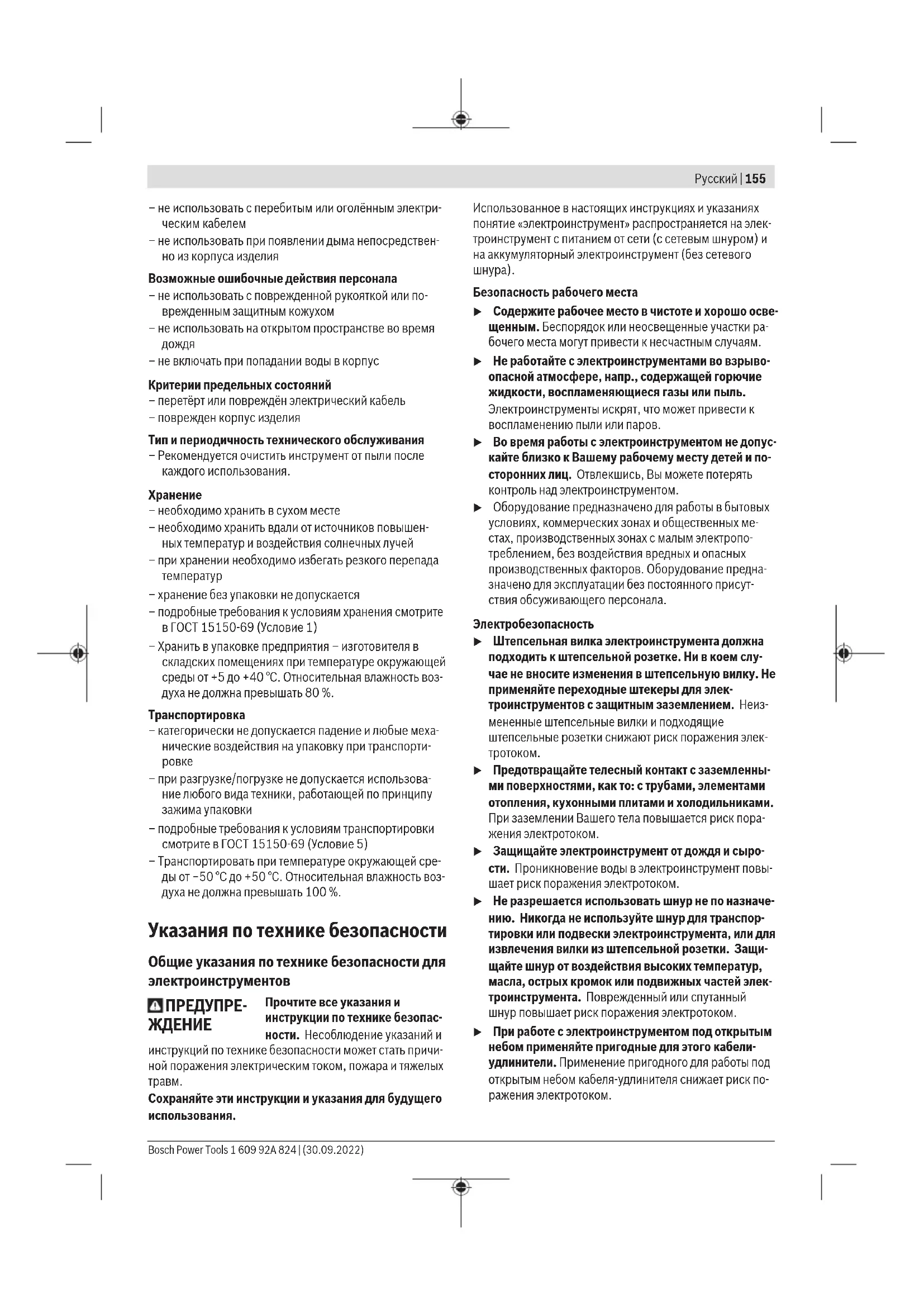 Toлько для стран Евразийского экономического союза (Таможенного союза) В состав эксплуатационных документов, предусмотрен- ных изготовителем для продукции, могут входить настоя- щее руководство по эксплуатации, а также приложения. Информация о подтверждении соответствия содержится в приложении. Информация о стране происхождения указана на корпу- се изделия и в приложении. Дата изготовления указана на последней странице об- ложки Руководства. Контактная информация относительно импортера содер- жится на упаковке. Срок службы изделия Срок службы изделия составляет 7 лет. Не рекомендует- ся к эксплуатации по истечении 5 лет хранения с даты изготовления без предварительной проверки (дату изго- товления см. на этикетке). Указанный срок службы действителен при соблюдении потребителем требований настоящего руководства. Перечень критических отказов – не использовать при сильном искрении – не использовать при появлении сильной вибрации 1 609 92A 824 | (30.09.2022) Bosch Power ToolsРусский | 155 – не использовать с перебитым или оголённым электри- ческим кабелем – не использовать при появлении дыма непосредствен- но из корпуса изделия Возможные ошибочные действия персонала – не использовать с поврежденной рукояткой или по- врежденным защитным кожухом – не использовать на открытом пространстве во время