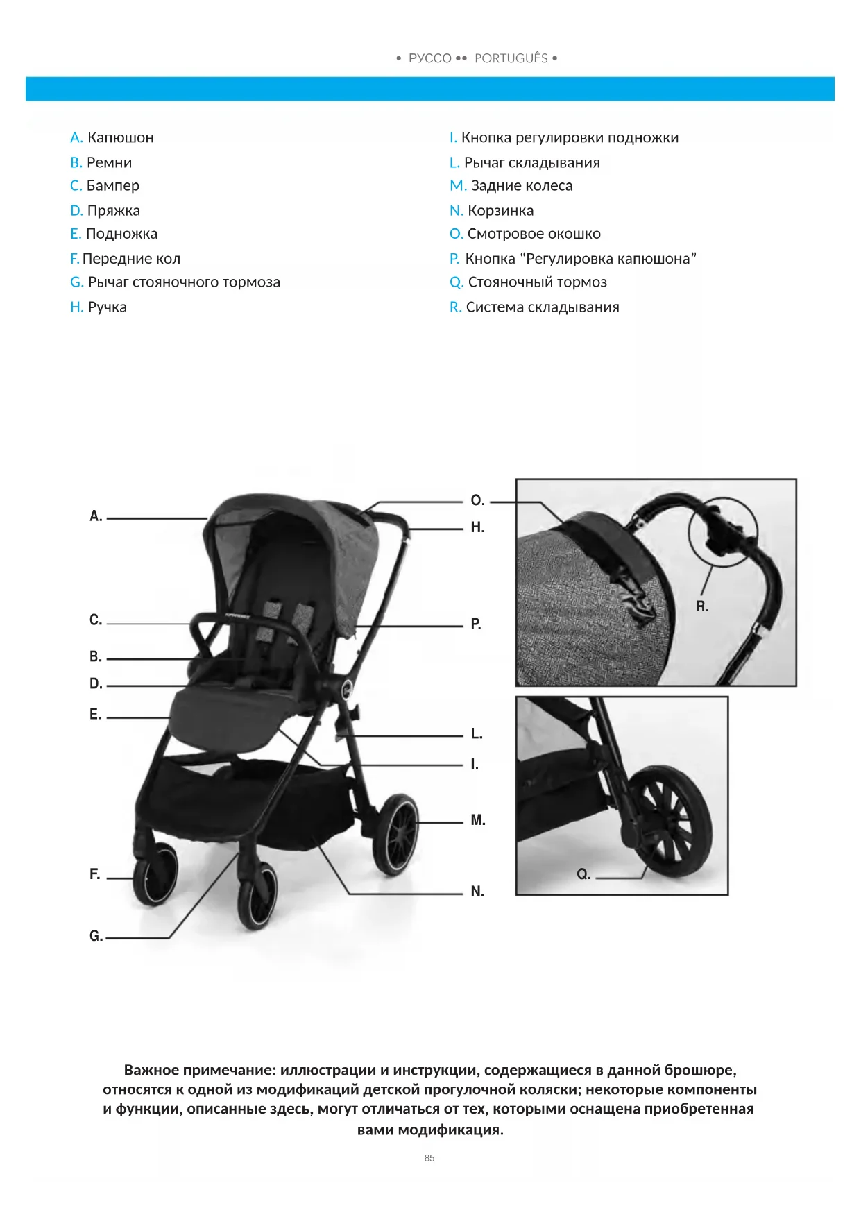 L. Рычаг складывания M. Задние колеса N. Корзинка O. Смотровое окошко P. Кнопка “Регулировка капюшона” Q. Стояночный тормоз R. Система складывания Важное примечание: иллюстрации и инструкции, содержащиеся в данной брошюре, относятся к одной из модификаций детской прогулочной коляски; некоторые компоненты и функции, описанные здесь, могут отличаться от тех, которыми оснащена приобретенная вами модификация.
