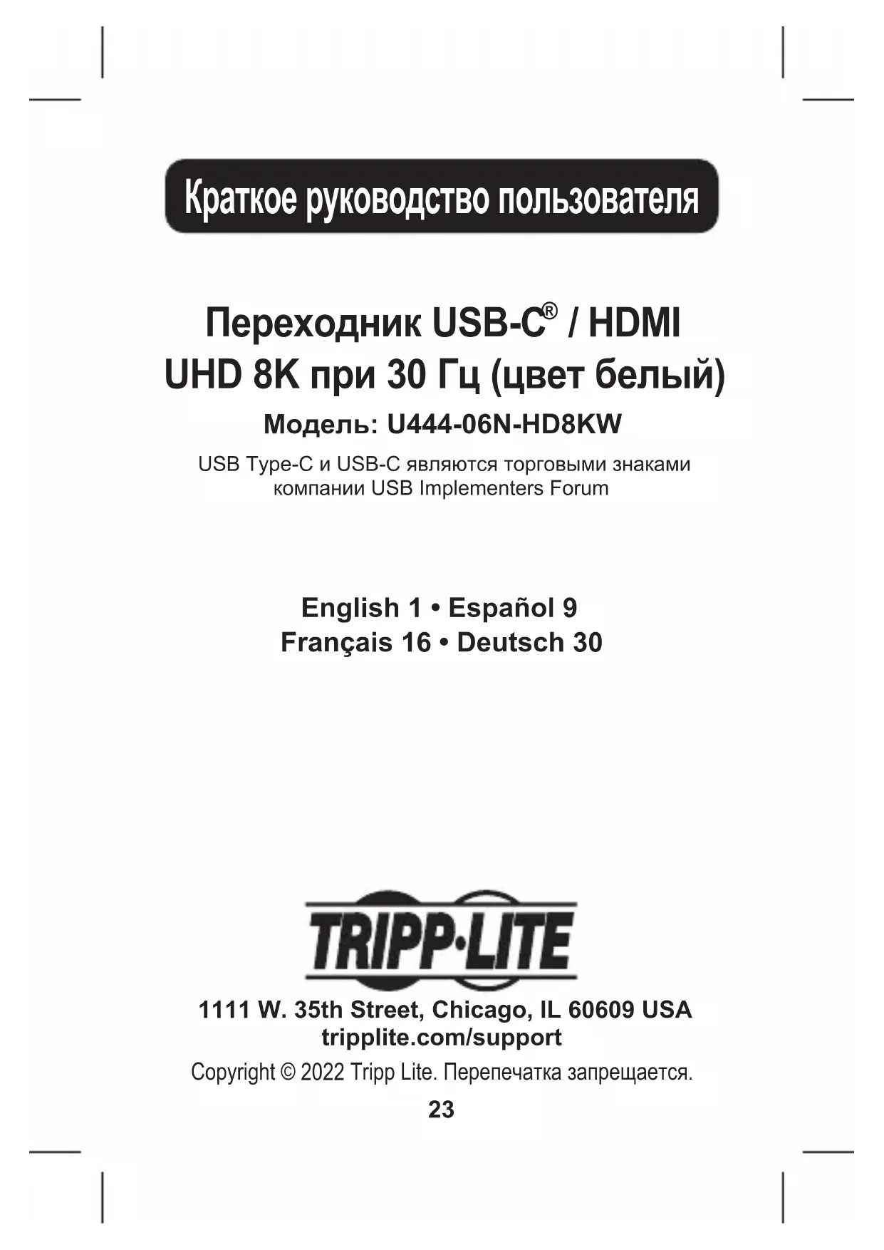 / HDMI UHD 8K при 30 Гц (цвет белый) Модель: U444-06N-HD8KW USB Type-C и USB-C являются торговыми знаками компании USB Implementers Forum English 1 • Español 9 Français 16 • Deutsch 3024