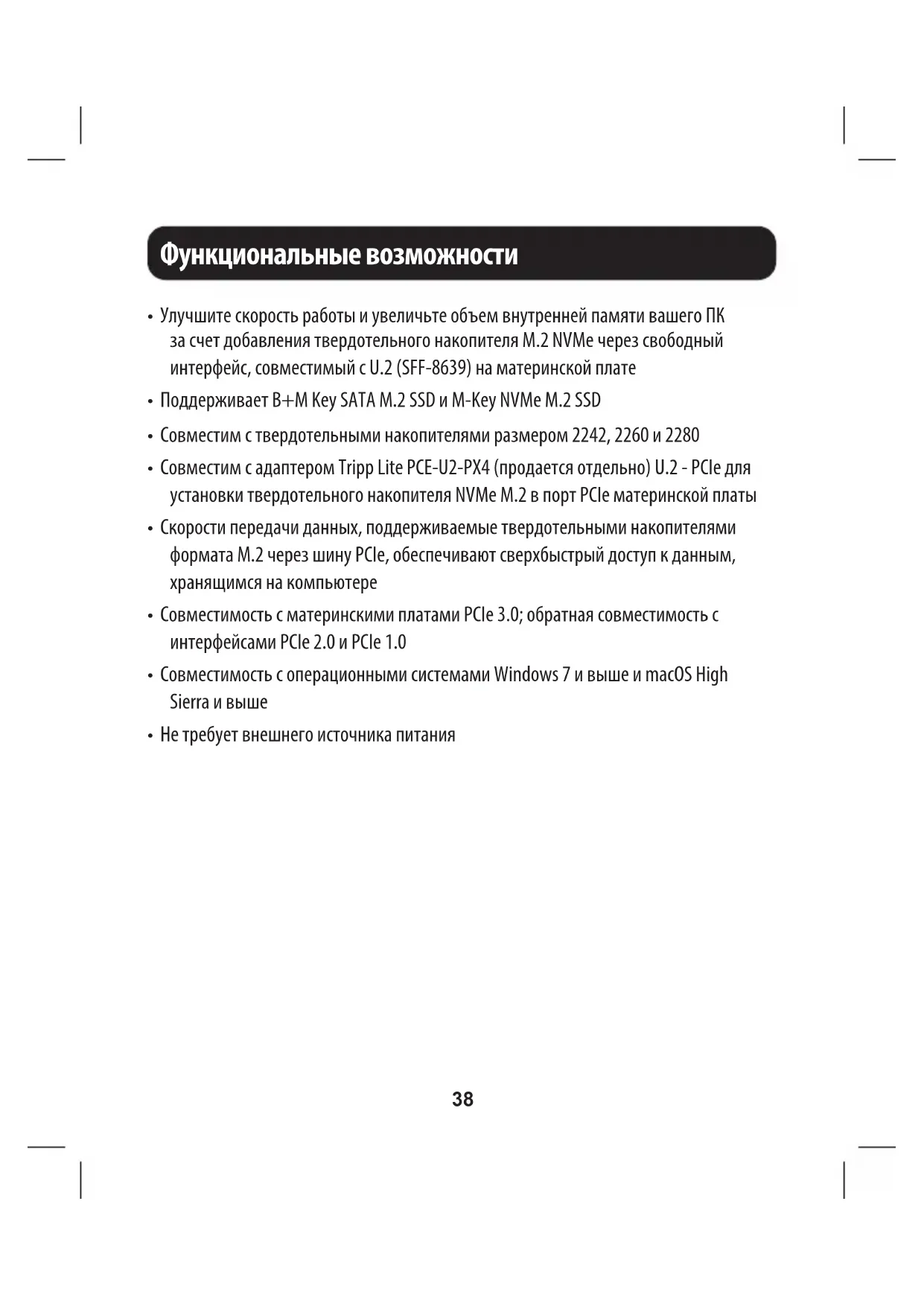 - Компьютер со свободным портом U.2 на материнской плате (или адаптером M.2 - U.2 (например, Tripp Lite PCE-U2-PX4) продается отдельно. Подробности см. на сайте tripplite.com.)