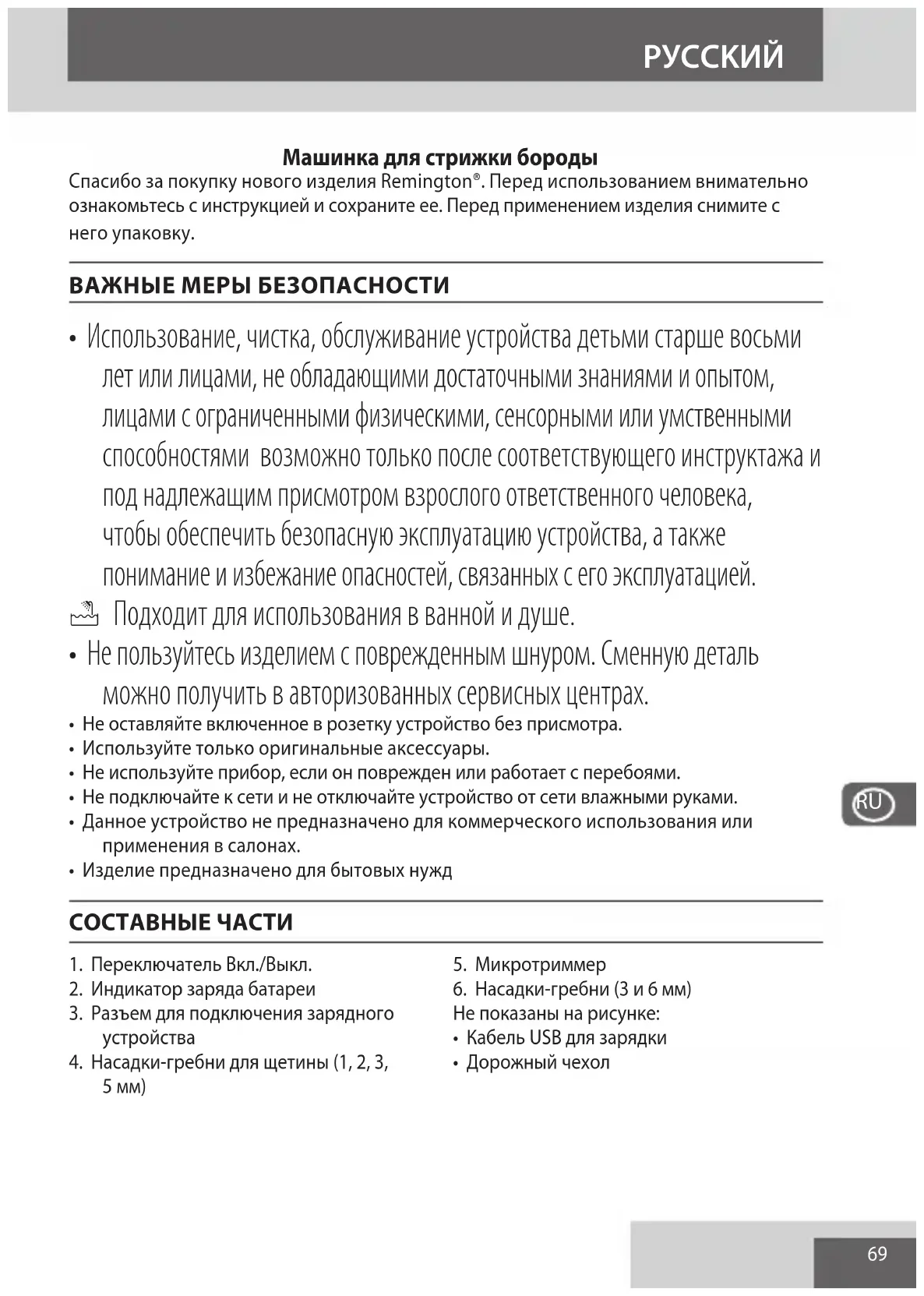 - Не оставляйте включенное в розетку устройство без присмотра.• Используйте только оригинальные аксессуары.• Не используйте прибор, если он поврежден или работает с перебоями.• Не подключайте к сети и не отключайте устройство от сети влажными руками.• Данное устройство не предназначено для коммерческого использования или применения в салонах.• Изделие предназначено для бытовых нужд СОСТАВНЫЕ ЧАСТИ 1. Переключатель Вкл./Выкл.2. Индикатор заряда батареи3. Разъем для подключения зарядного устройства4. Насадки-гребни для щетины (1, 2, 3, 5мм)5. Микротриммер6. Насадки-гребни (3 и 6мм)Не показаны на рисунке:• Кабель USB для зарядки • Дорожный чехол PУCCKИЙ