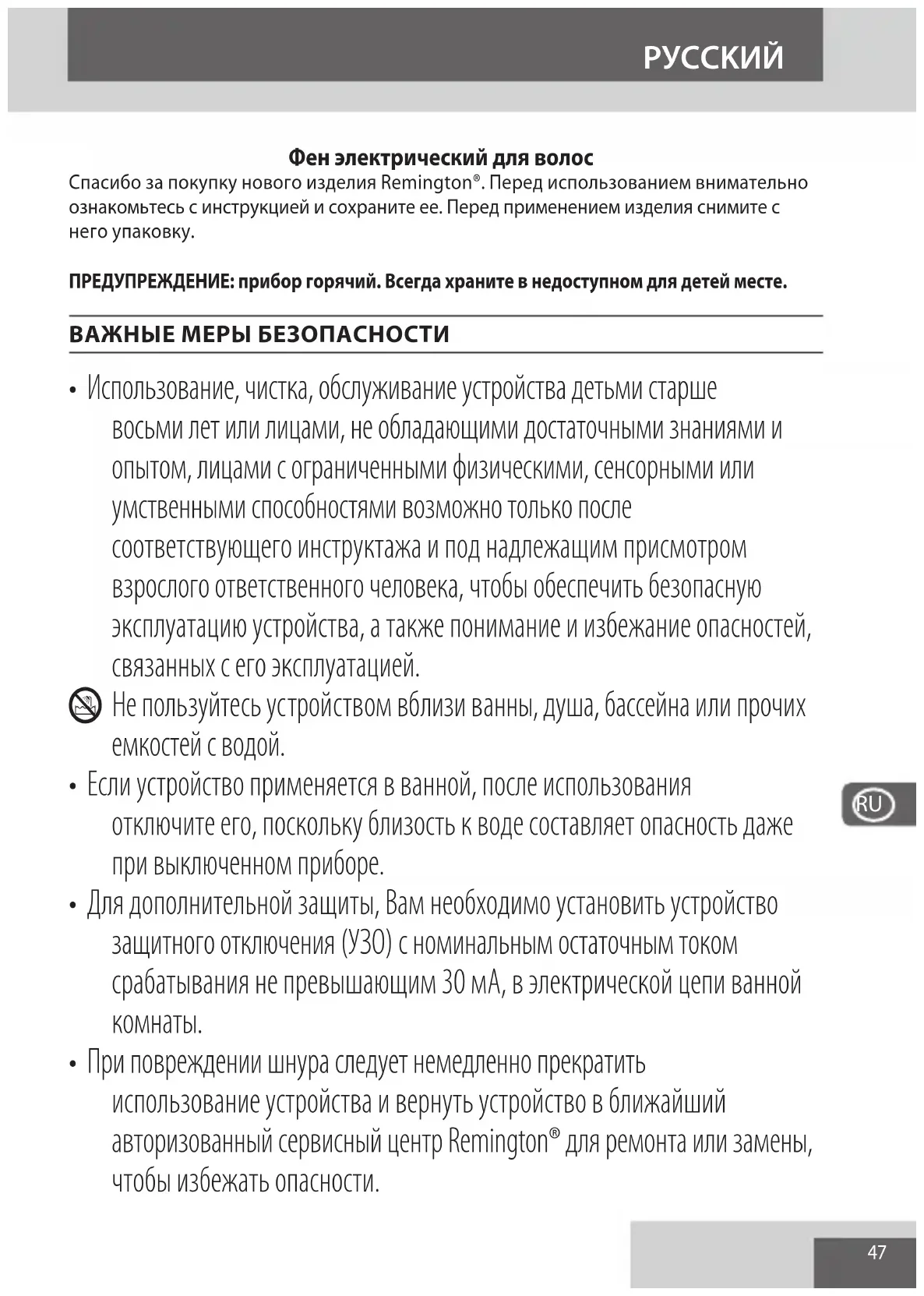 - При повреждении шнура следует немедленно прекратить использование устройства и вернуть устройство в ближайший авторизованный сервисный центр Remington® для ремонта или замены, чтобы избежать опасности.
