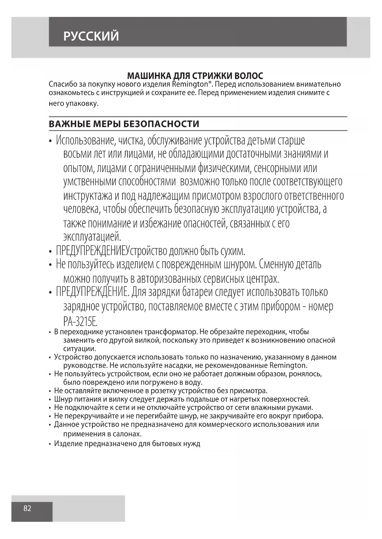 AE82 МАШИНКА ДЛЯ СТРИЖКИ ВОЛОС Спасибо за покупку нового изделия Remington®. Перед использованием внимательно ознакомьтесь с инструкцией и сохраните ее. Перед применением изделия снимите с него упаковку. ВАЖНЫЕ МЕРЫ БЕЗОПАСНОСТИ
