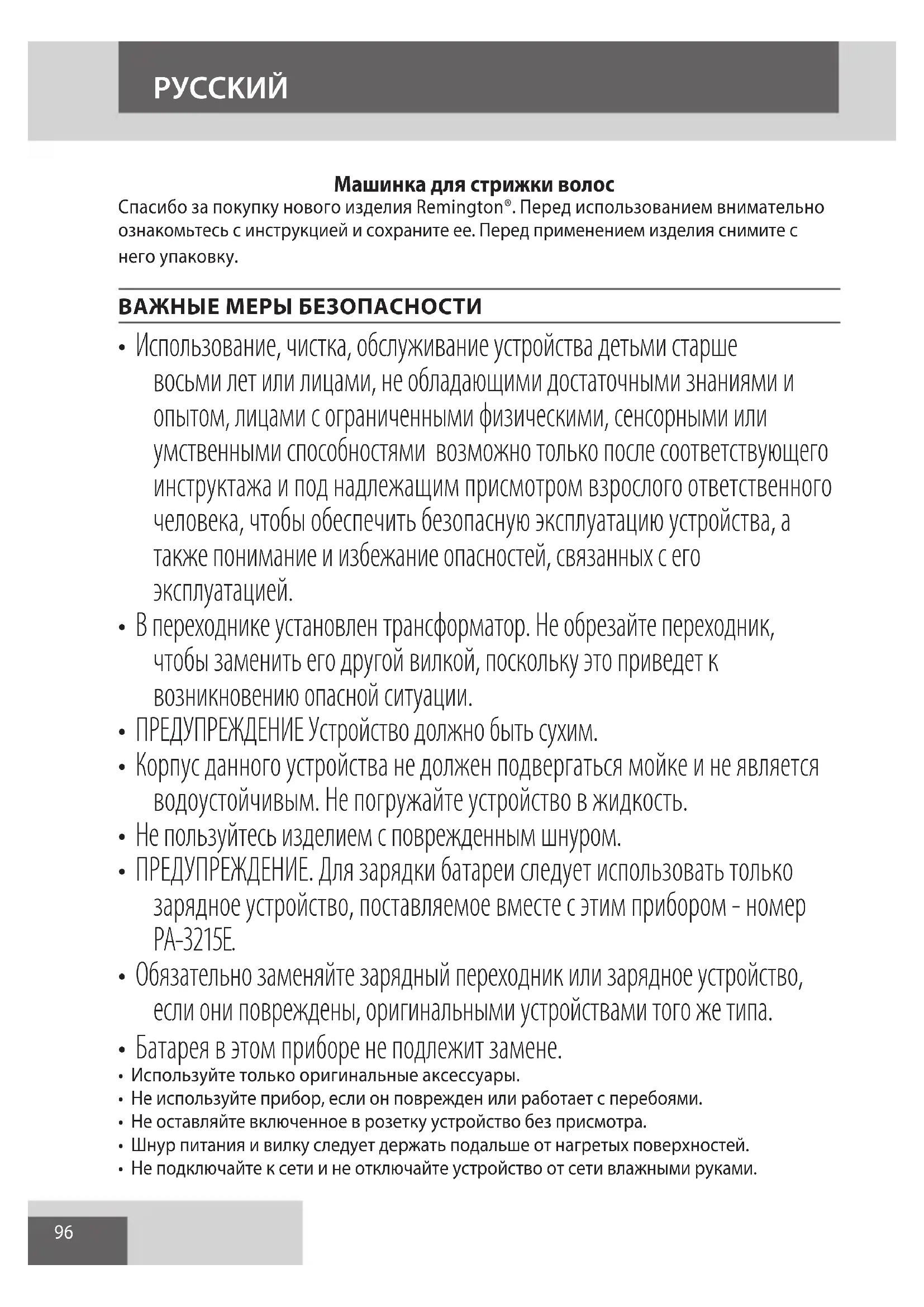 AE96 PУCCKИЙ Машинка для стрижки волос Спасибо за покупку нового изделия Remington®. Перед использованием внимательно ознакомьтесь с инструкцией и сохраните ее. Перед применением изделия снимите с него упаковку. ВАЖНЫЕ МЕРЫ БЕЗОПАСНОСТИ