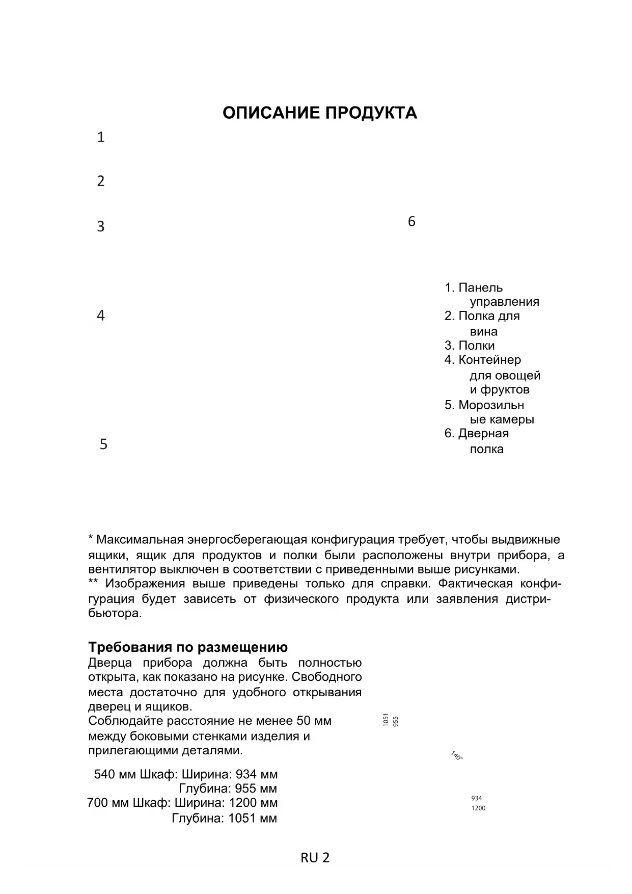 3. Полки4. Контейнердля овощейи фруктов5. Морозильные камеры6. Двернаяполка* Максимальная энергосберегающая конфигурация требует, чтобы выдвижныеящики, ящик для продуктов и полки были расположены внутри прибора, авентилятор выключен в соответствии с приведенными выше рисунками.** Изображения выше приведены только для справки. Фактическая конфи- гурация будет зависеть от физического продукта или заявления дистри- бьютора.Требования по размещению Дверца прибора должна быть полностью открыта, как показано на рисунке. Свободного места достаточно для удобного открывания дверец и ящиков. Соблюдайте расстояние не менее 50 мм между боковыми стенками изделия и прилегающими деталями.540 мм Шкаф: Ширина: 934 ммГлубина: 955 мм700 мм Шкаф: Ширина: 1200 ммГлубина: 1051 мм